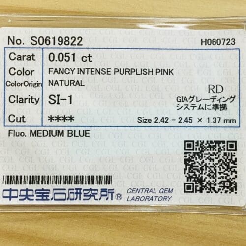 明るく発色の良い青みのあるピンクダイヤモンドです。人気の高いラウンドブリリアントカットです。ピンクとパープルが混ざり合った絶妙なカラー!彩度も強くとても鮮やかで上品な可愛らしさを持っています。見ていて胸が高鳴るような心引き付けられるピンクダイヤモンド!SIクラスで目立つインクルージョンもなく透明感があり、とても綺麗です。