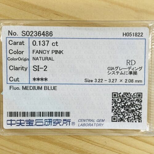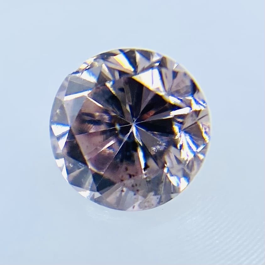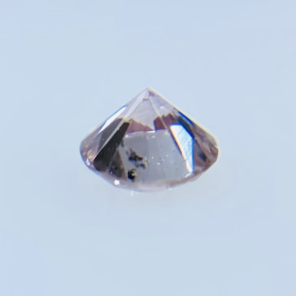 FANCY PINK 優しい色味の桜ピンクです。FANCY PINKとありますが、色は乗っています。さらに健康的なカラーで石の中からパワーが溢れているように感じます。カットは人気の高いラウンドブリリアントカットです。内放物は小さいカーボンがテーブル端にあります。全体的に透明感があり大変綺麗です。メイクもよく、テリも良いです。