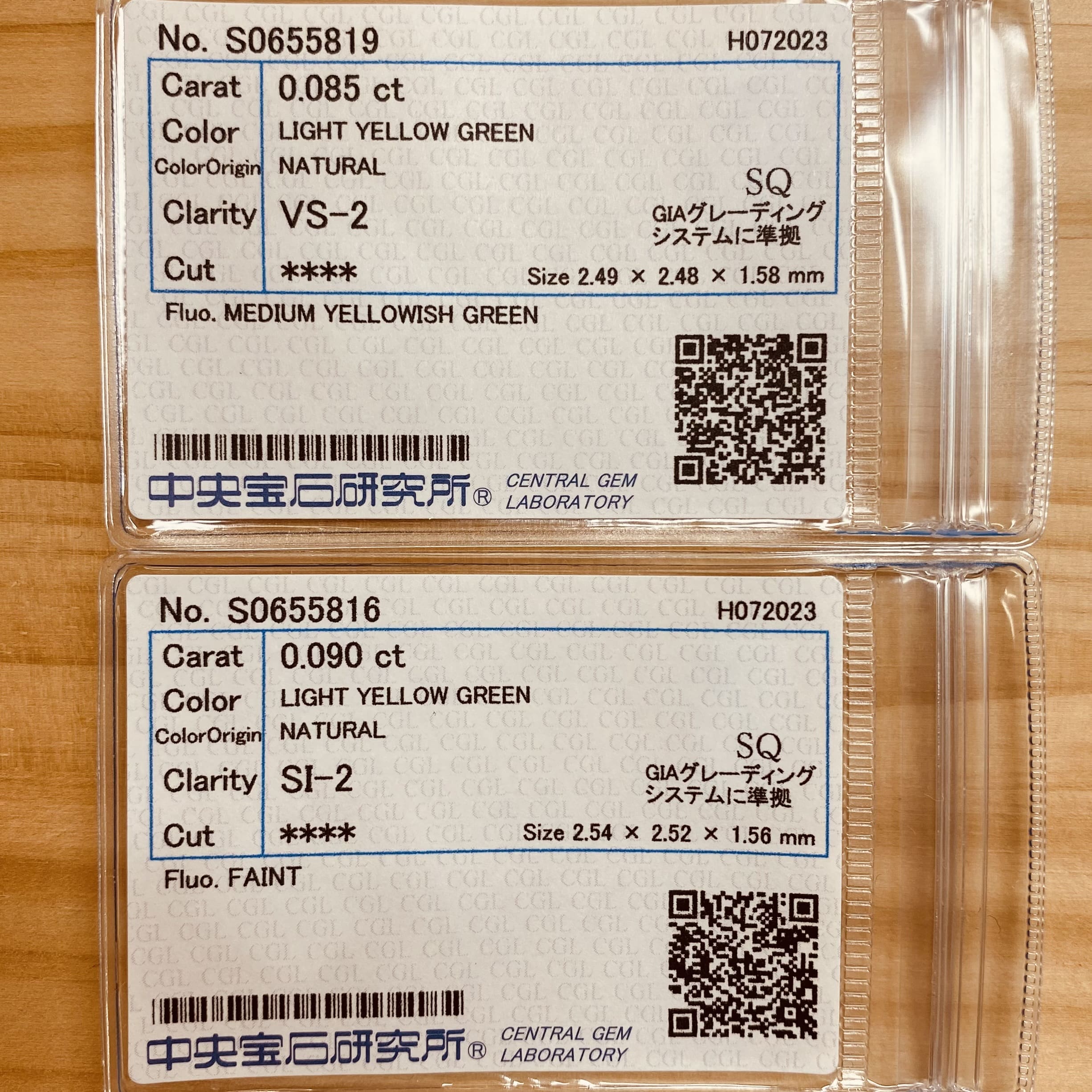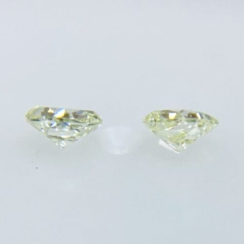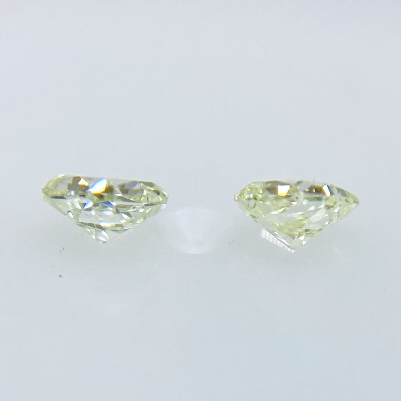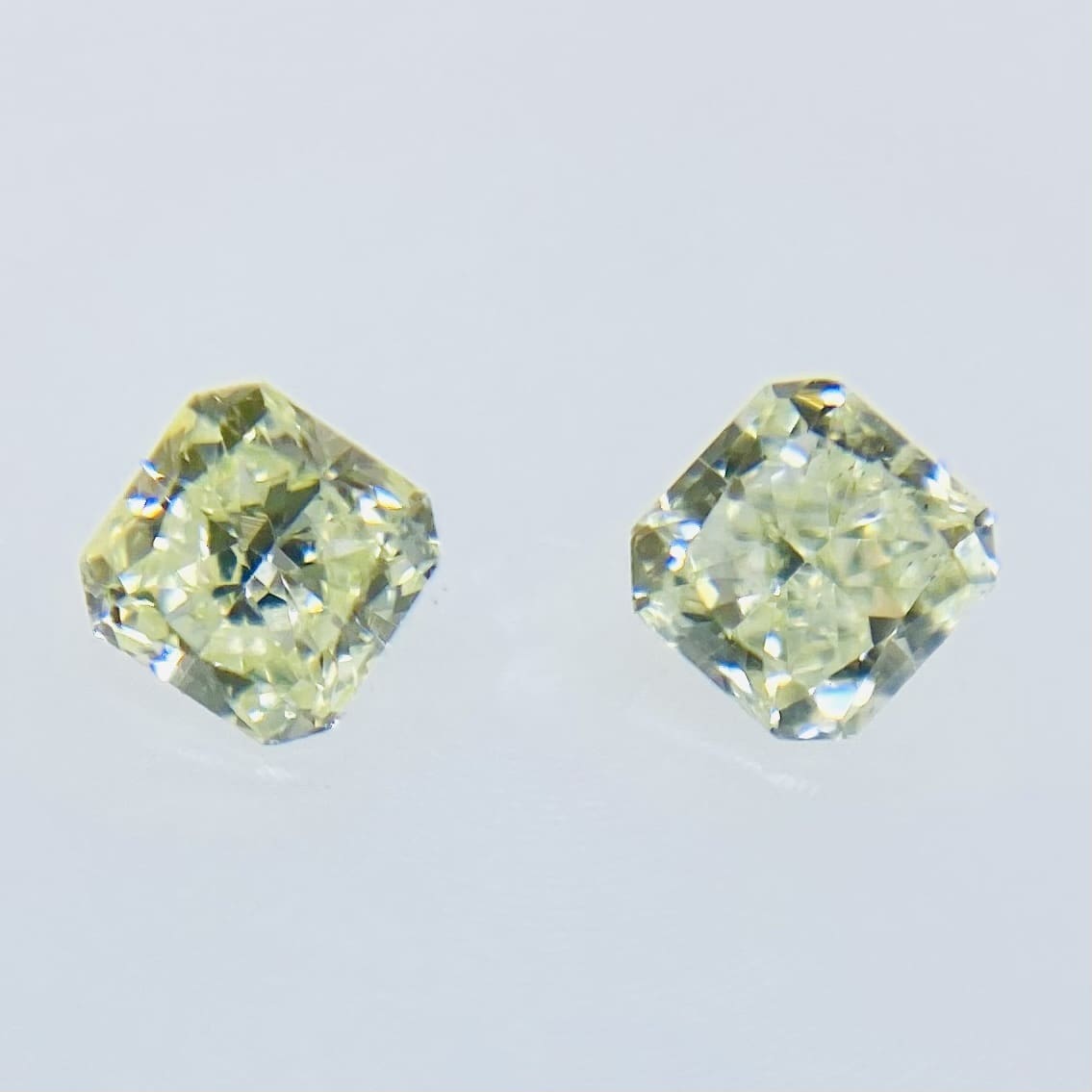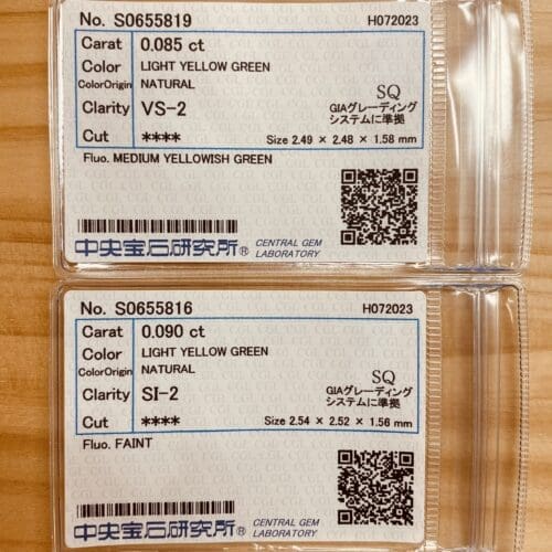 *こちらはセットでの販売です。夏前の草木の若葉のようなやわらかな LIGHT YELLOW GREEN高い彩度と明るい色です。若葉に朝露のようにみずみずしい透明感と揺らめきがある石です。色も形もペアに相応しいダイヤモンドです。テリの良さを含め、非常によく似ています。カットは正方形に近い品のあるスクエアカットです。VS/SIクラスで、どちらも目立つ内包物はなくとても綺麗なペア石です。また、MEDIUM YELLOWISH GREENの蛍光性が更にこの石の魅力を引き出していると感じます。