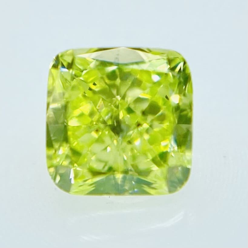 ネオンカラーがとても眩しいFANCY VIVID YELLOW GREENダイヤモンドです。こんなに不思議な色が、ナチュラルカラーなんて本当に地球の神秘でしかありません。明度も非常に高く目に焼き付いてしまう美しいカラーです!カットはバランスの良いクッションカットです。SIクラスで、小さいカーボン肉眼では見えません。強い光を当てなくともキラキラしています。STRONG YELLOWISH GREEN の強い蛍光性がありさらにこのダイヤモンドのパワーを引き出していると感じます。