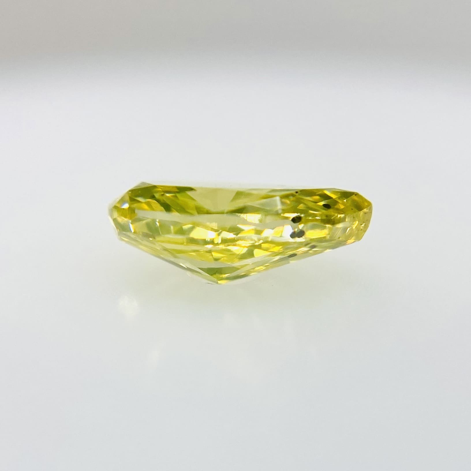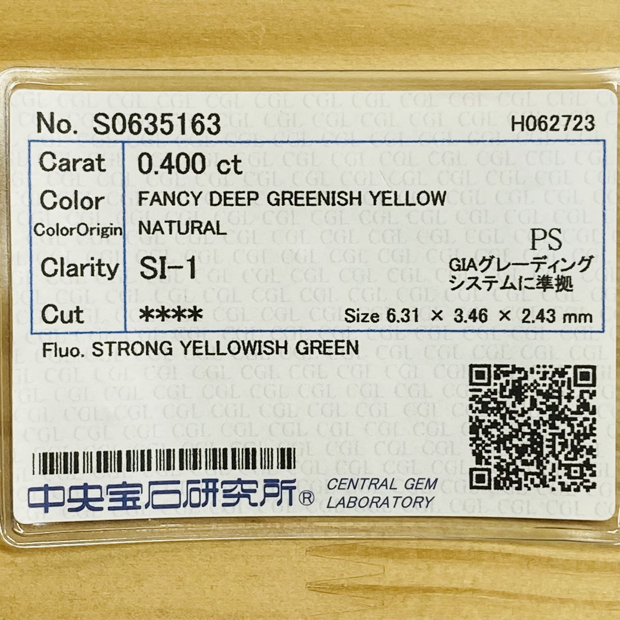 グリーンとイエローのバランスが絶妙DEEPですが、濃すぎず暖かみのあるカラーです。石全体から瑞々しい魅力が溢れているダイヤモンドです!ビタミンカラーでもあり元気をもらえる石であることは間違いないです!カットはふっくらと柔らかなクッションカットです。SIクラスで、とても微細なインクルージョンがほんの少しある程度で透明感とテリの良さを兼ね備え、綺麗です!STRONG YELLOWISH GREEN の強い蛍光性もありこの石の美しさを更に際立たせていると感じます。