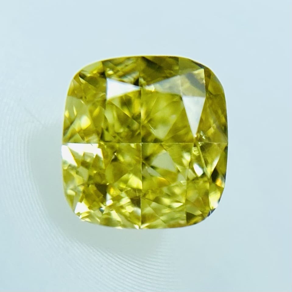 透明感、明るさともに最高レベルのイエローダイヤモンドです。元気がもらえる事間違いないです。FANCY VIVID YELLOW石の奥から力強い魅力を感じるダイヤモンドです。ビタミンカラーを身に着けてキラキラが輝きたい方にお勧めのイエローダイヤモンドです。カットは、少し丸みのあるクッションカットです。VSクラスで、テーブルクリーンで綺麗な石です。