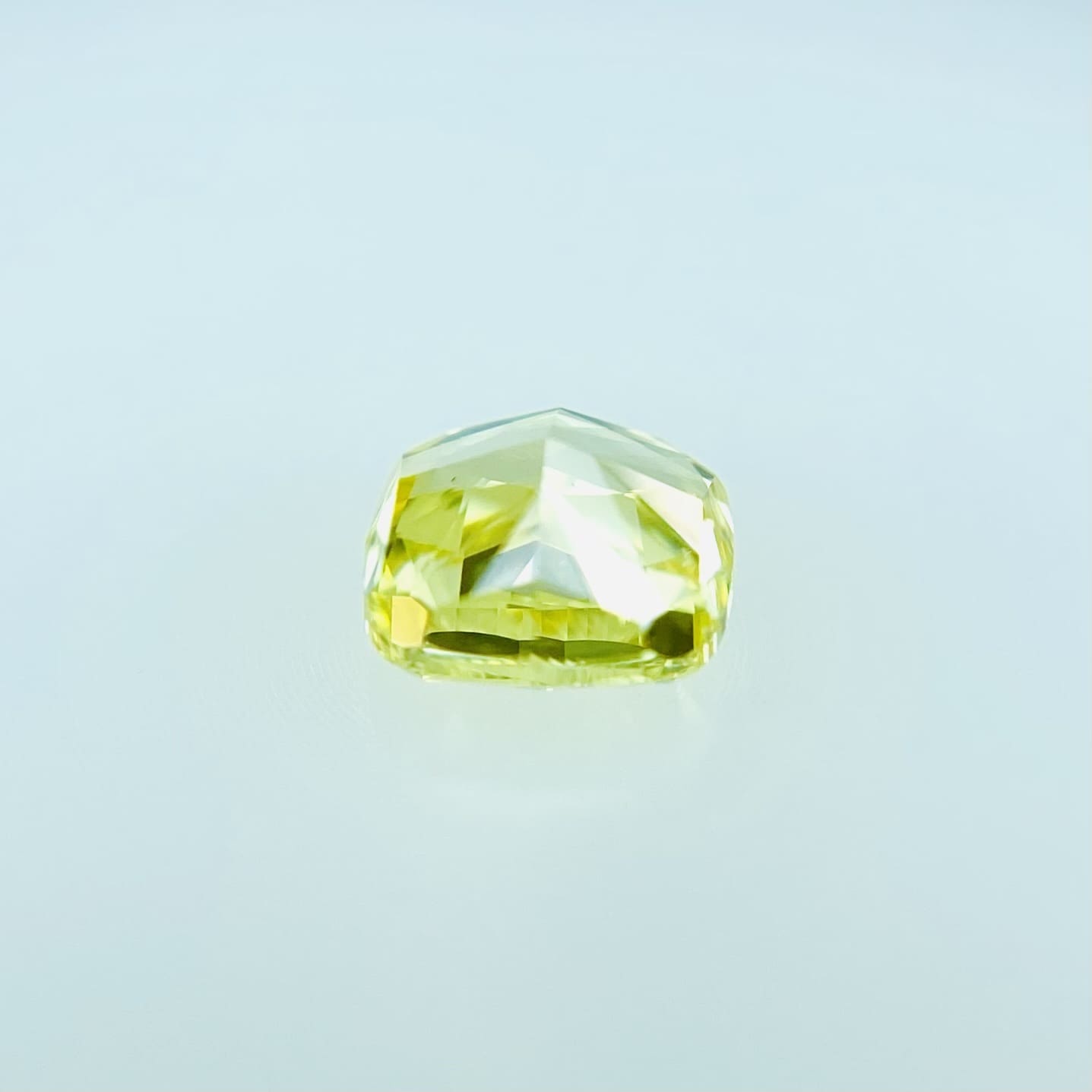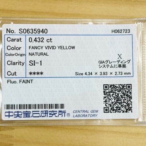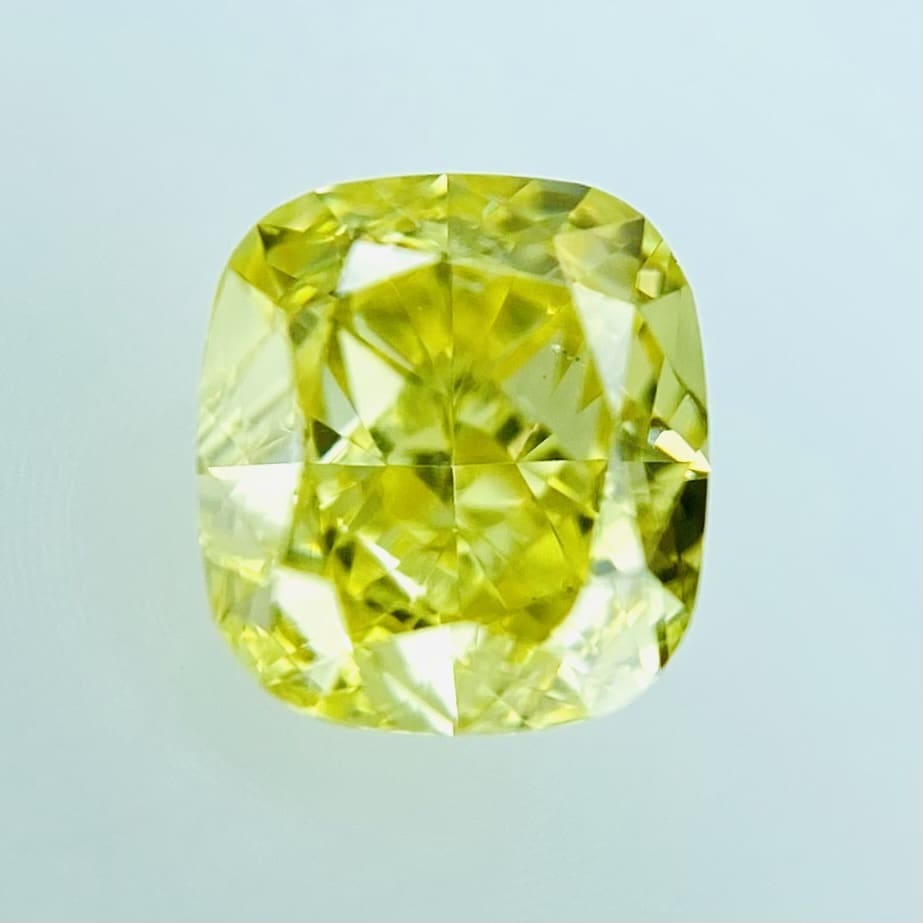 透明感、明るさともに最高レベルのイエローダイヤモンドです。元気がもらえる事間違いないです。FANCY VIVID YELLOW石の奥から力強い魅力を感じるダイヤモンドです。ビタミンカラーを身に着けてキラキラが輝きたい方にお勧めのイエローダイヤモンドです。カットは少し丸みのあるクッションカットです。SIクラスで、テーブルクリーンで綺麗な石です。