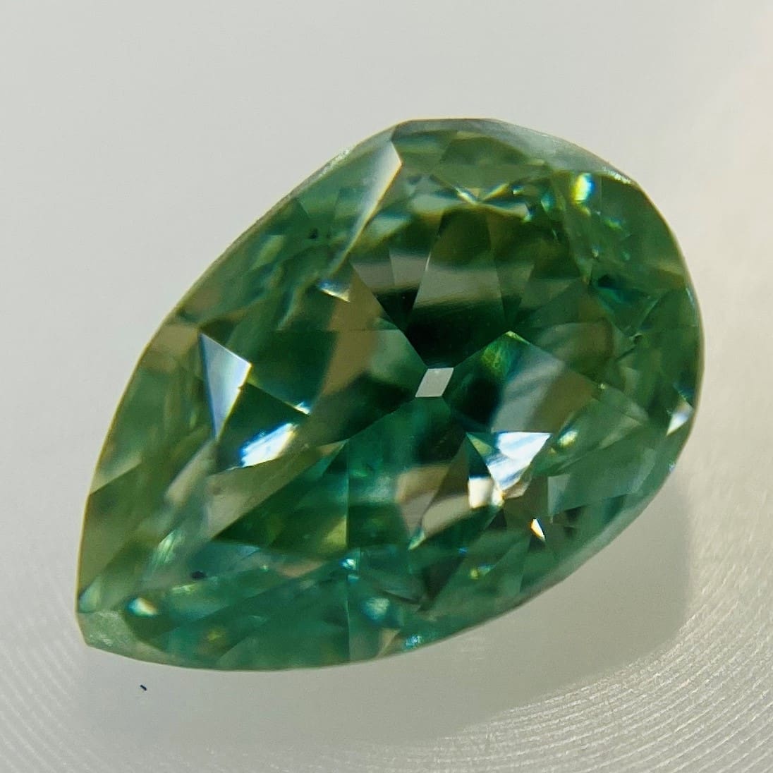次に いつ出会えるかわからない、幻の 純色!FANCY VIVID GREEN !明るくて、濃厚で、 抜群に鮮やかです。とても希少な混じりけのないストレートグリーンです。美しい発色と 煌めきです。究極の逸品!カットはバランスよいペアシェイプです。VSでテーブルクリーンな石です。