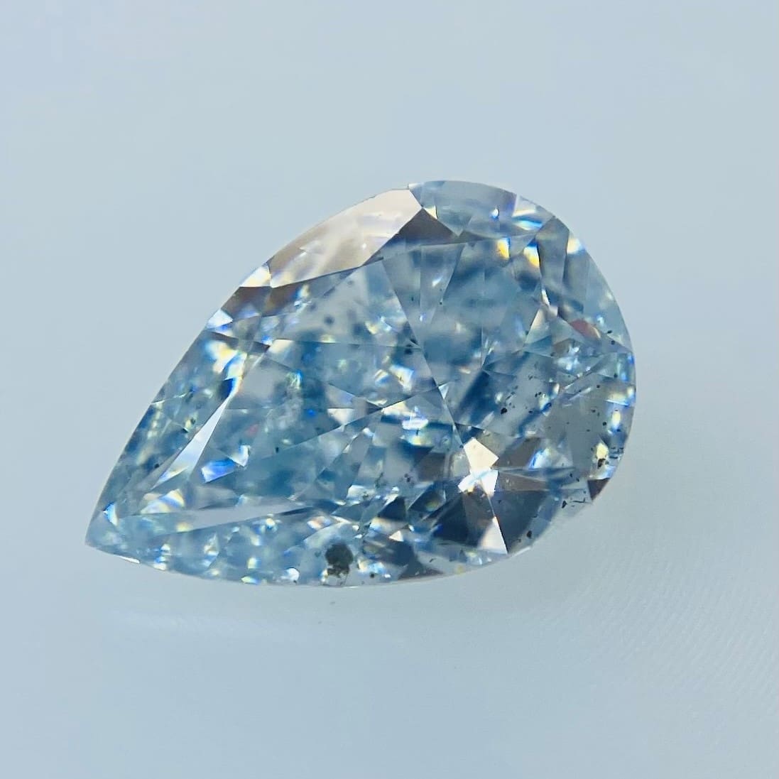 FANCY GREENISH BLUEですがインテンスと同じくらいかなり色味は強いです。くっきりと美しく、みずみずしい色合いに誰もが見惚れてしまいます…。南国の深い海に潜っているような、神秘的で身も心も包まれる逸品です。SIグレードで、極小の黒色インクルージョンが点在しています。ウィングのにも黒色インクルージョンがあります。テリが良いので目立ちません。シェイプは可愛らしいペアシェイプです。