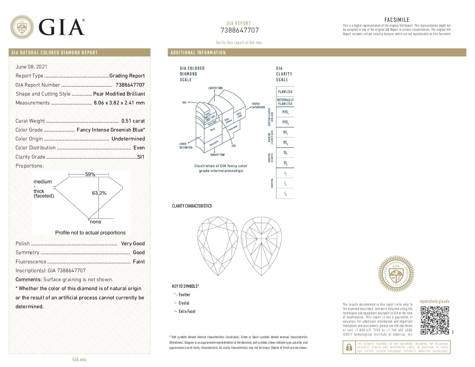 透き通る湖のようなINTEMSE GREENISH BLUEINTENSEの中でもかなり彩度は高く、大変美しいです。水面の光がキラキラ反射しているようにテリもよいです。SIクラスで目立つ内包物もなく、透明感もあり素晴らしいブルーダイヤモンドです。色の起源がUNDETERMINEDとなっております。こちらは、色の起源がUNDETERMINED(未定/現時点判別不可)です。青・緑系のダイヤモンドの起源はすべてのダイヤモンドについて自信を持って決定することは難しく場合によっては自然に照射されたグリーン系ダイヤモンドを実験室で照射されたグリーン系ダイヤモンドから分離することは現時点では困難または不可能だそうです。