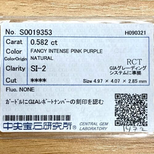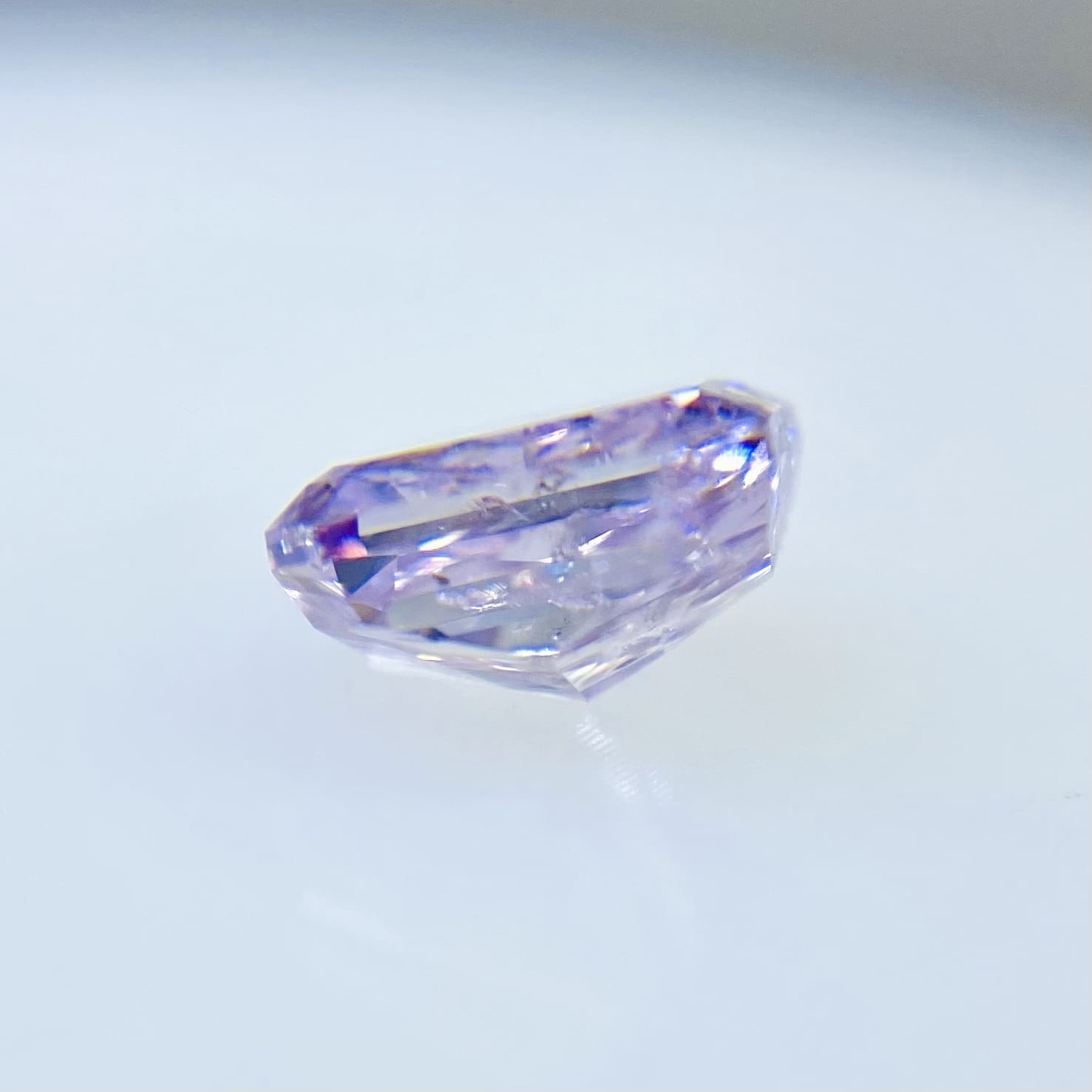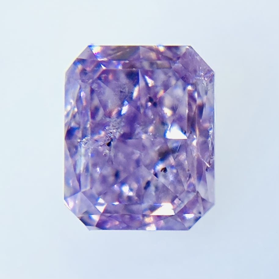 GIA ガードルNO.6382601534ピンクとパープルが混ざり合った絶妙なカラーです。見た目はパステルカラーを思わせます。テリもよく彩も強く鮮やかです。0.582ctとパープルダイヤモンドではかなりの大きさがあります。カットはスタイリッシュなレキュタンギュラーです。SIクラスで、白いフェザーと、小さいカーボンがあります。透明感がありながらも、色彩があり大変素晴らしいです。