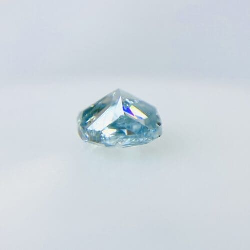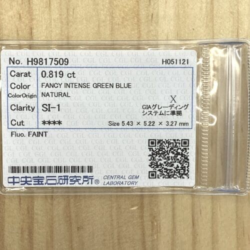 とても美しく希少なインテンスグリーンブルーです。FANCY INTENSE GREEN BLUEに相応しいとても鮮やかな色合いです。みずみずしい色合いに、誰もが見惚れてしまいます…。南国の深い海に潜っているような神秘的で身も心も包まれる逸品です。小さな白傷と、小さなカーボンありますが肉眼では見えず、美観を全く損ないません!シェイプはバランスの良い、クッションカットです。