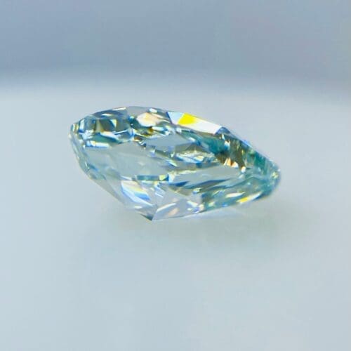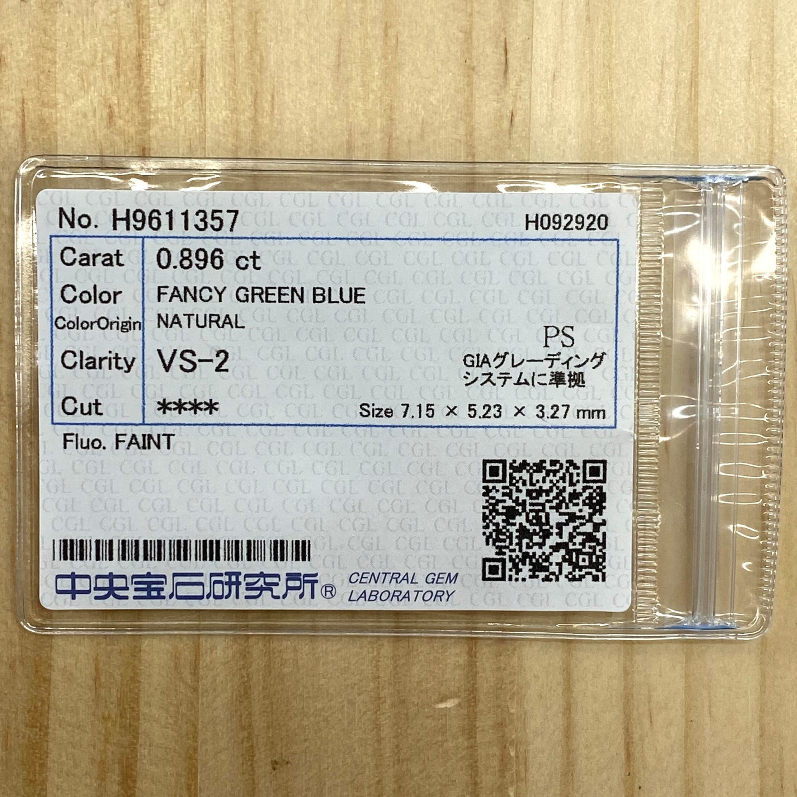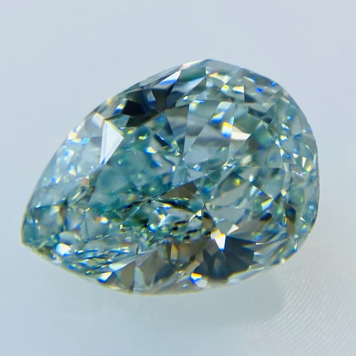 FANCY GREEN BLUEですがインテンスと同じくらいかなり色味は強いです。くっきりと美しく、みずみずしい色合いに誰もが見惚れてしまいます…。南国の深い海に潜っているような神秘的で身も心も包まれる逸品です。VSなので、目立つインクルージョンもなく、とても美しいです。ヘッドのガードルに原石部分を残してあります。天然カラーの証となるものです。シェイプは可愛らしいペアシェイプです。