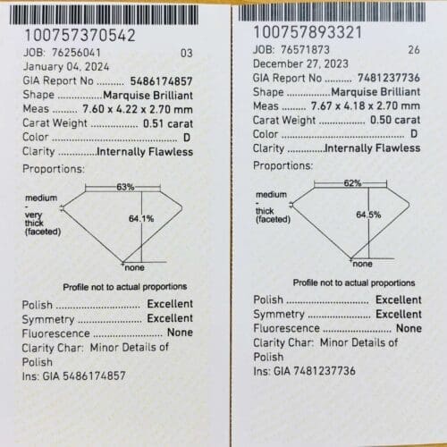 0.500 cts D IF0.510 cts D IF*こちらは、セットでの販売です。GIA NO.7481237736GIA NO.54861748570.50ct D INTERNALLY FLAWLESS0.51ct D INTERNALLY FLAWLESS最高峰のグレードのセット石です。希少で更にペアになっているのです!縦と横のバランスがとてもよいマーキーズカットです。キラキラの照りが最強です!マーキーズカットは、ジュエリーカットの方法のひとつです。一般的には57の面で構成されていて楕円の両端を細く尖らせたラグビーボールのような形をしています。「マーキーズ」は、フランス語で「侯爵夫人」という意味の言葉。「マーキーズカット」という名前は、ルイ15世の愛妾であったポンパドール侯爵夫人にちなんでつけられたと言われています。縦と横の割合は厳密には決まっていませんが1:2であることが多いです。ラウンド付近ブリリアントカットに飽きてしまった方や人と違ったものをお持ちになりたい方にもお勧めです。