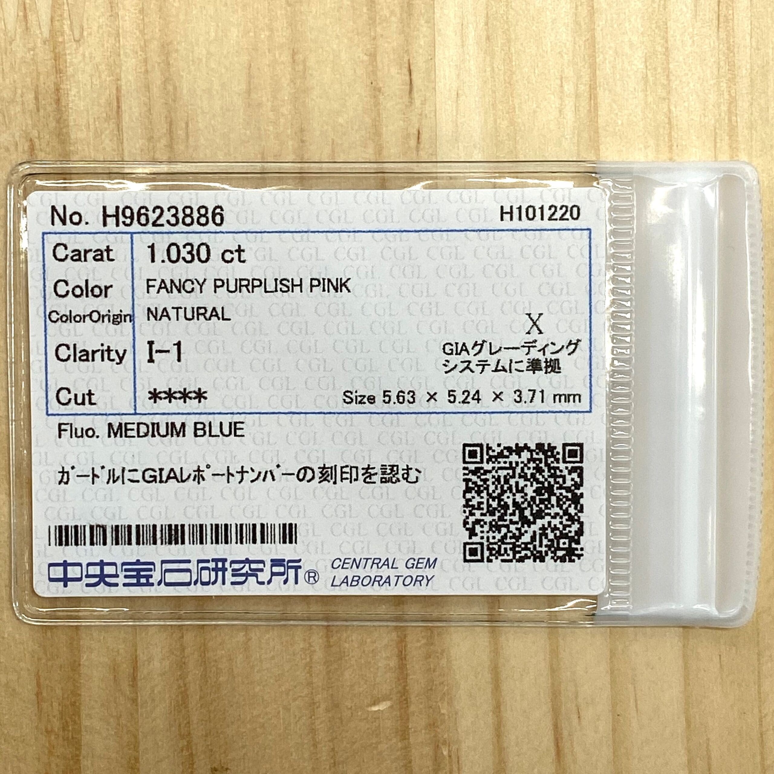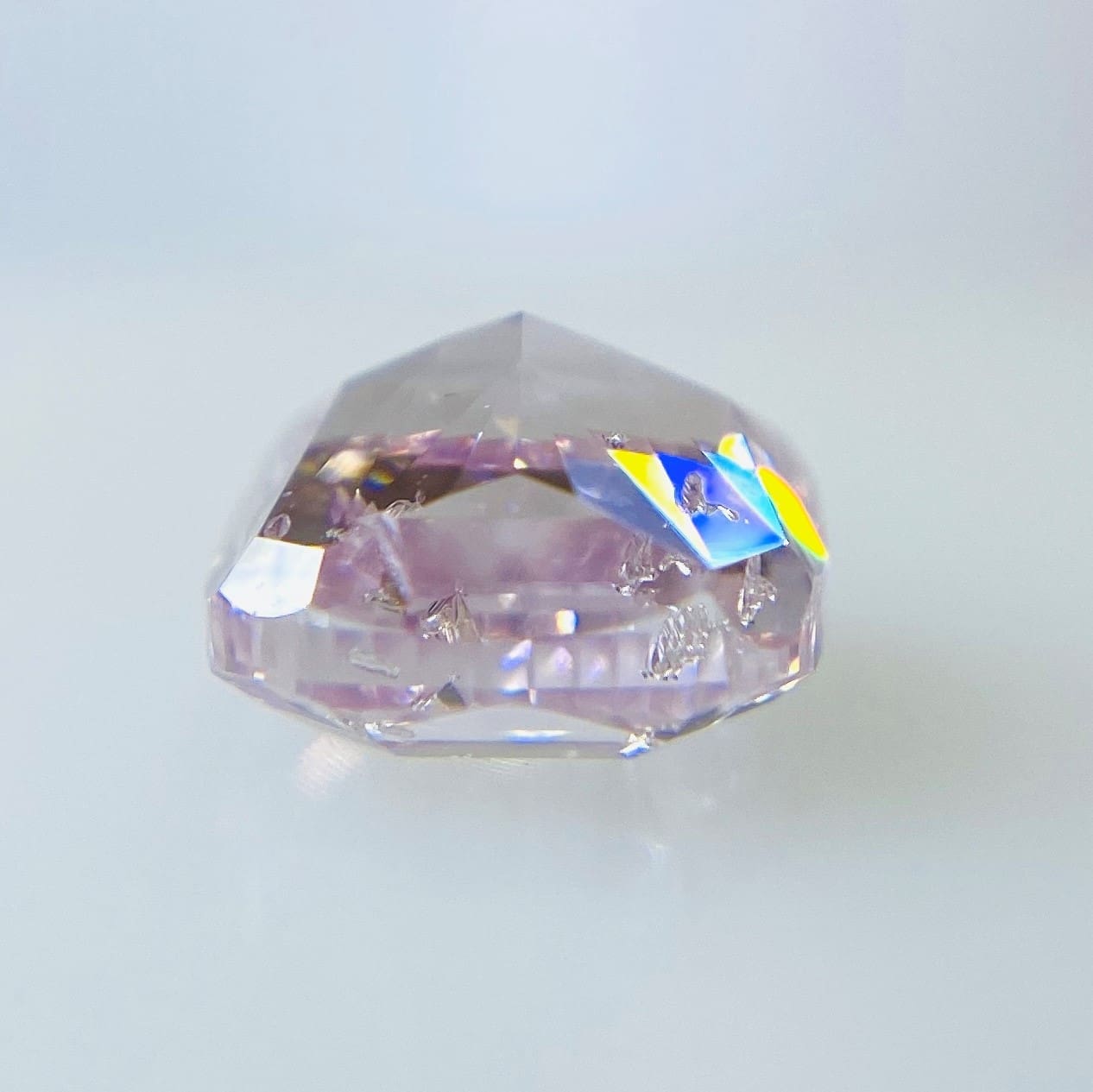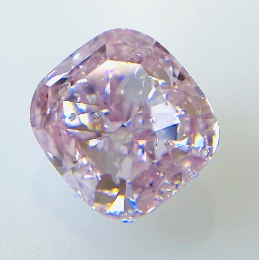 GIAガードルNO.5201739588FANCY PURPLISH PINKでとても優しい、桜の花のようなピンクです。透明感もあり、パステルカラーを思わせる色合いでもあります。1.030ctとボリュームもあり、大変希少価値も高いです。カットは少し丸みのあるクッションカットに近くとても可愛らしいです。