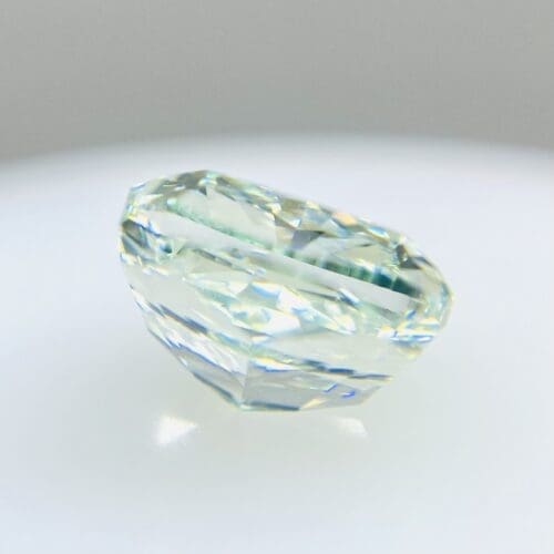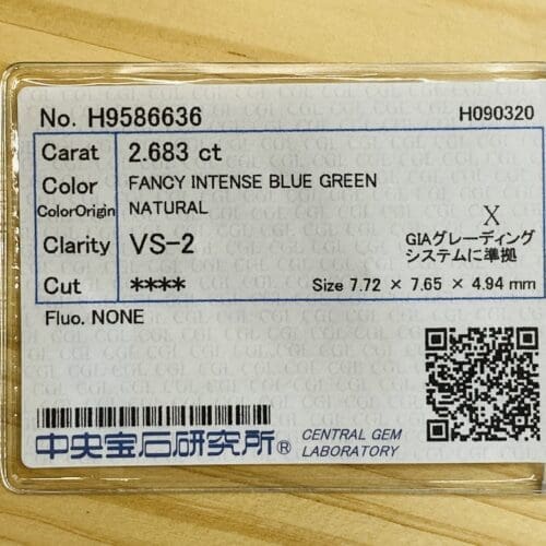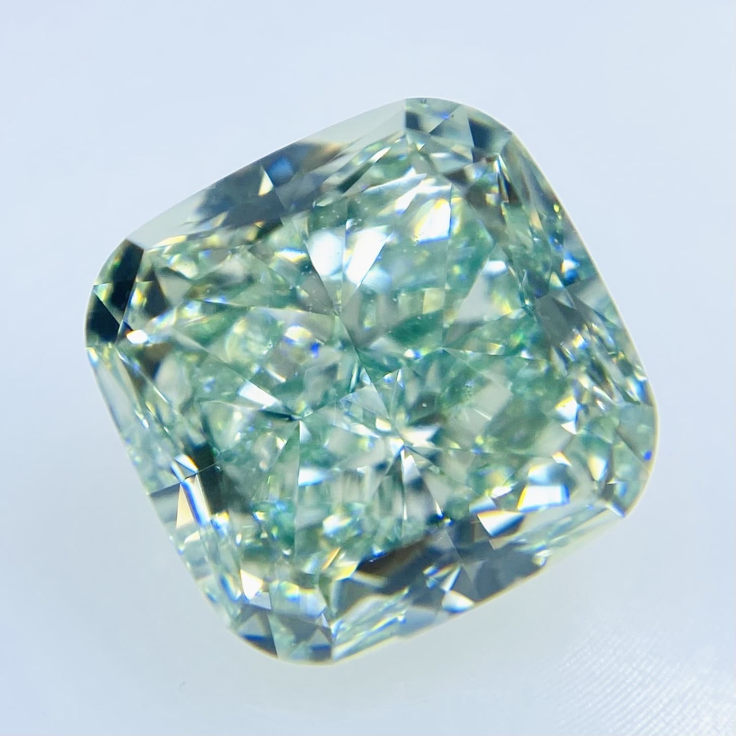 迫力の2.683ct!これが本当にダイヤモンドなんだろうか?!と目を疑うような、カラーと大きさを持つカラーダイヤモンドです。透き通るように美しいグリーンダイヤモンドです。ダイヤをのぞき込むと、美しい万華鏡のようにキラキラが眩しいです。透明とグリーンンのコントラストが艶々2.6ctあると場面も非常に大きいです。このような希少なカラーと希少な大きさは資産としても相応しいダイヤモンドです。カットはバランスの良い、クッションカットです。クラリティグレードはVSで目立つような傷はありません。