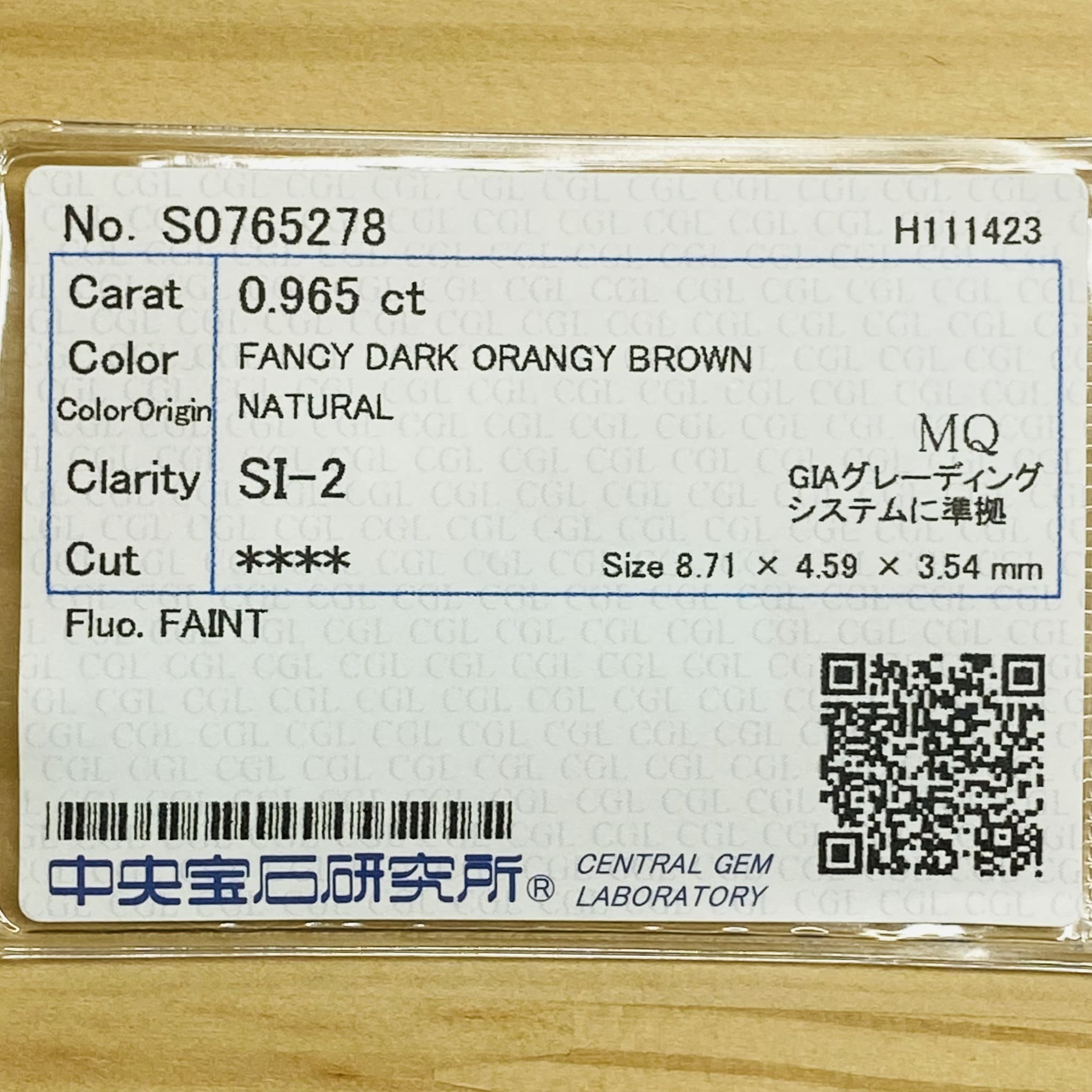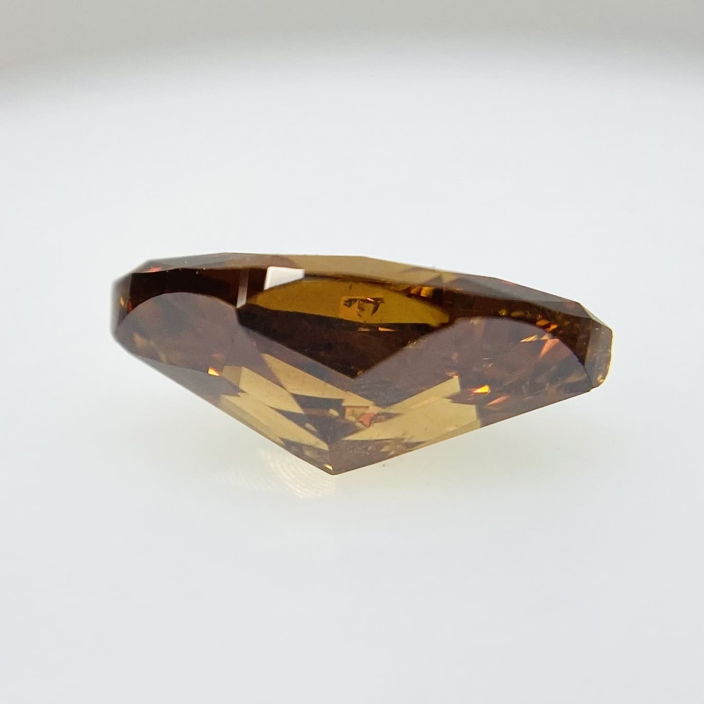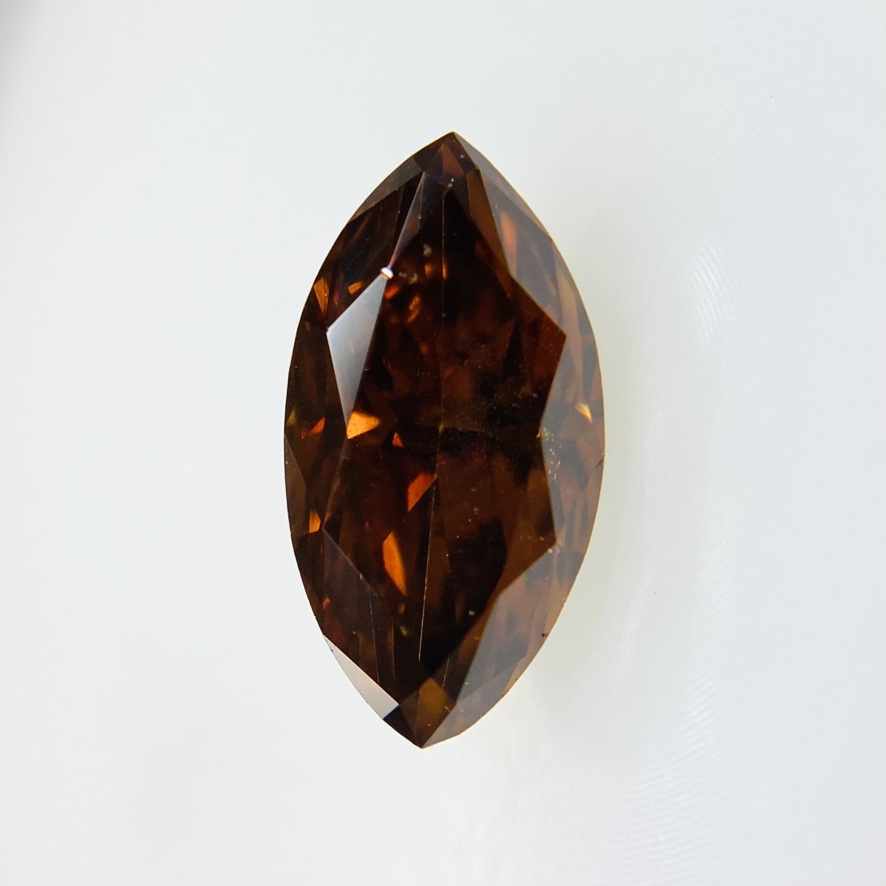 FANCY DARK ORANGY BROWNはイエローとオレンジが混ざったオレンジ色で太陽や炎のような陽気であたたかいそして、力強いオレンジです。終わりはブラウンですが、見た目は深みのあるオレンジカラーに見えます。テリがあり、深みがあるダイヤモンドです。バランスの良いマーキーズカットです。SIグレードでテーブルクリーンで綺麗な石です。