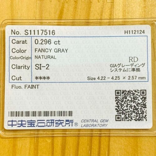 人気の高いラウンドブリリアントカットです。メタリックなグレーカラーです。メイクの良いラウンドブリリアントカットの輝きもプラスされキラキラが眩しいほどです。グレーダイヤモンドは、あまり市場に出回らないレアストーンとなります。グレーカラーよりも、無色透明のダイヤモンドが重要視された為です。近年価値が見直され、需要は増えつつあります。それでも数は少ないです。グレーは水素が入ることにより色がつくので、内包物によるカラーではなく原子レベルで色がついているようです。フェザーがありますが美しさに支障はありません。