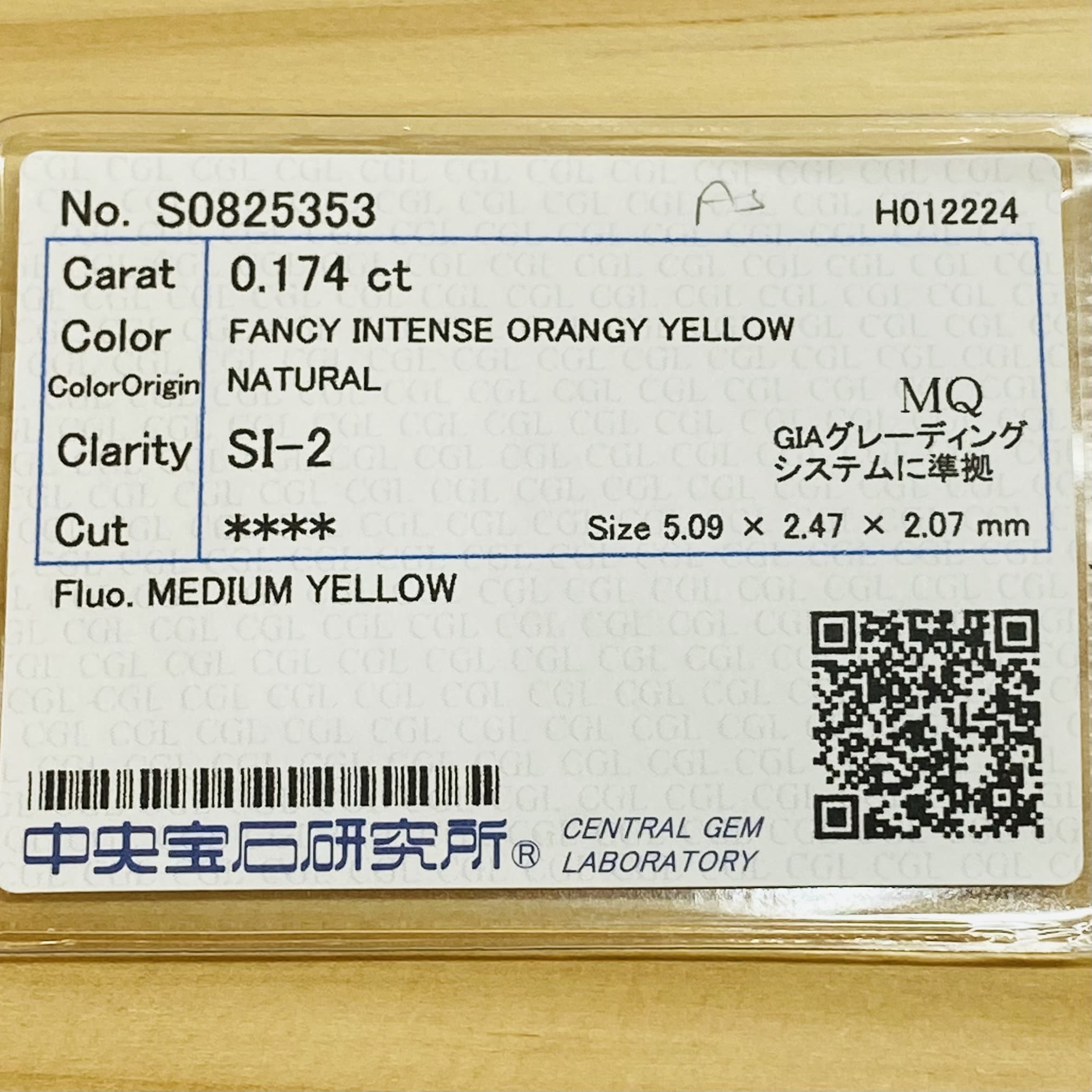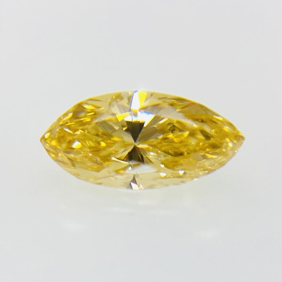FANCY INTENSE ORANGY YELLOWはオレンジは明るい赤と黄色が混ざった色で太陽や炎のような陽気であたたかい高揚感を表す色です。光が海面に反射して、キラキラしているようにも感じさせるFANCY INTENSE ORANGY YELLOWのダイヤモンドです。INTENSEにふさわしくしっかりと色がのった明るいオレンジィイエロービタミンカラーでもあり元気をもらえる石であることは間違えないです!SIで、フェザーありますがボディーカラーが濃い為美しさを損なう事はありません。カットはスラッとしたマーキーズカットです。
