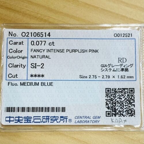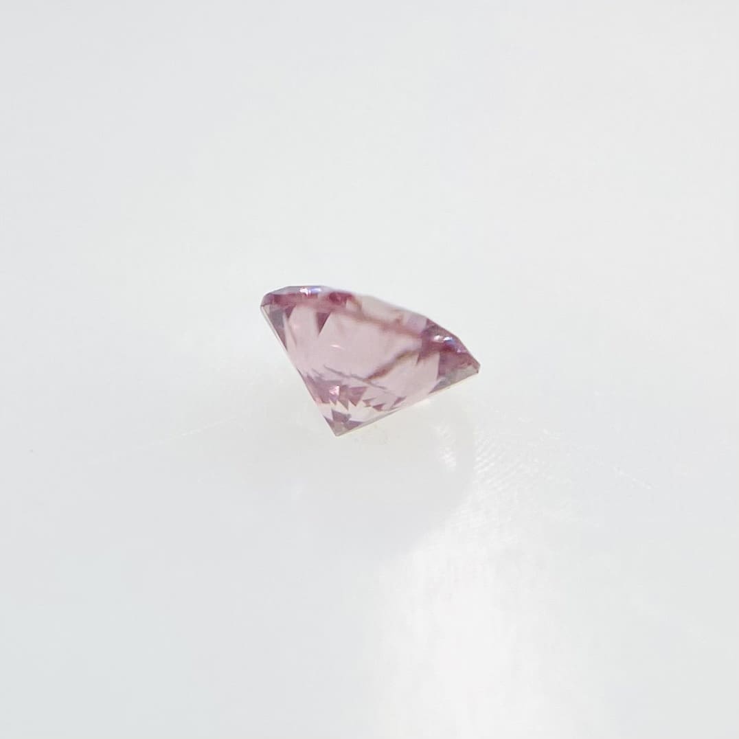 パッと発色の良さと、色の濃さがを感じるFANCY INTENSE PURPLISH PINKです。メイクがいいのでブリリアンスがとても良いです。また、ラウンドならではのキラキラ感を楽しんでいただける良いピンクです。ピンクとパープルが混ざり合った絶妙なカラー!彩度も強くとても鮮やかで、上品な可愛らしさを持っています。見ていて胸が高鳴るような、心引き付けられるピンクダイヤモンド!人気の高いラウンドブリリアントカットになります。端にフェザーがありますが照りが良いため、美しさを損なうこともなく透明感があり、とても綺麗です。
