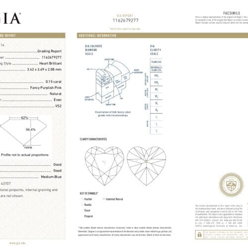 ARGYLE NO.43707アーガイル産のピンクダイヤモンドは世界シェア90%以上の驚異的な産出量からダイヤモンド業界で揺るぎないグレードを誇っています。世界最大にして最高のピンクダイヤモンドの産地オーストラリアのアーガイル鉱山が2020年10月末に閉山しました。その歴史は40年前後と、ダイヤモンド鉱山としてはあまりに短命でしたが歴史に残るカラーダイヤモンドを数多く産出した鉱山として広く名が知られています。産出されるダイヤモンドの中には「ピンク」「レッド」「ブルー」「ヴァイオレット」と稀に見る希少価値の高いカラーダイヤモンドが含まれ美しさのみならず、その産出量は世界シェア90%以上という驚異的なものでした。FANCYとありますが色味は少し濃く感じます。クラリティーもとても良いので、キラキラ感と透明感があります。カットは可愛らしいくてバランスのよいハートカットです。
