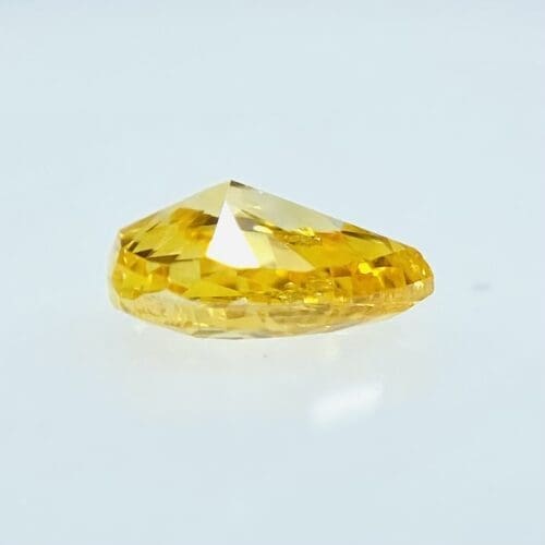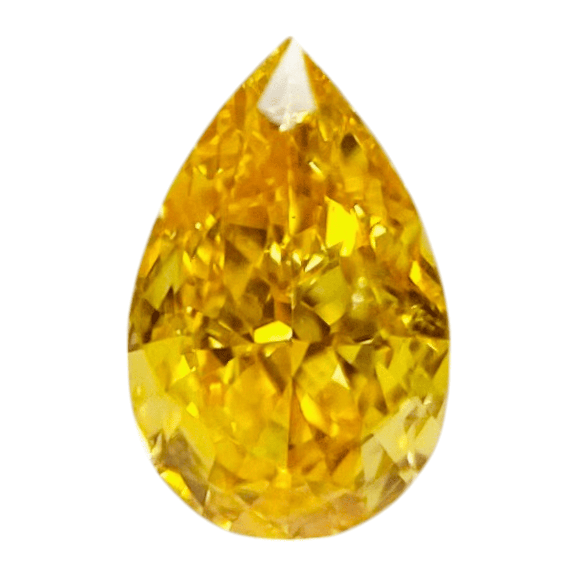 とても明るい、スッキリしたオレンジカラーです。瑞々しいキラキラが眩しい程です。VIVIDのタイプだと濃すぎて茶色みが強いものが多いですがこちらはしっかり濃厚なオレンジを感じていただけると思います。ビタミンカラーでもあり元気をもらえる石であることは間違いないです!カットはバランスの良い、ペアシェイプです。SIクラスで、大きな内包物もなく透明感があり、とても綺麗です。MEDIUM YELLOW の蛍光性がこの石の美しさを更に引き立てていると感じます。