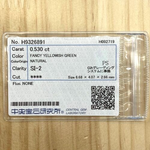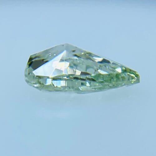 イエローとグリーンが混ざり合った絶妙なカラー!爽やかで、優しい色味のグリーンダイヤモンドです。少し縦長のペアシェイプです。SIグレードで、テーブルに透明なインクルージョンと薄っすら有色のインクルージョンがあります。