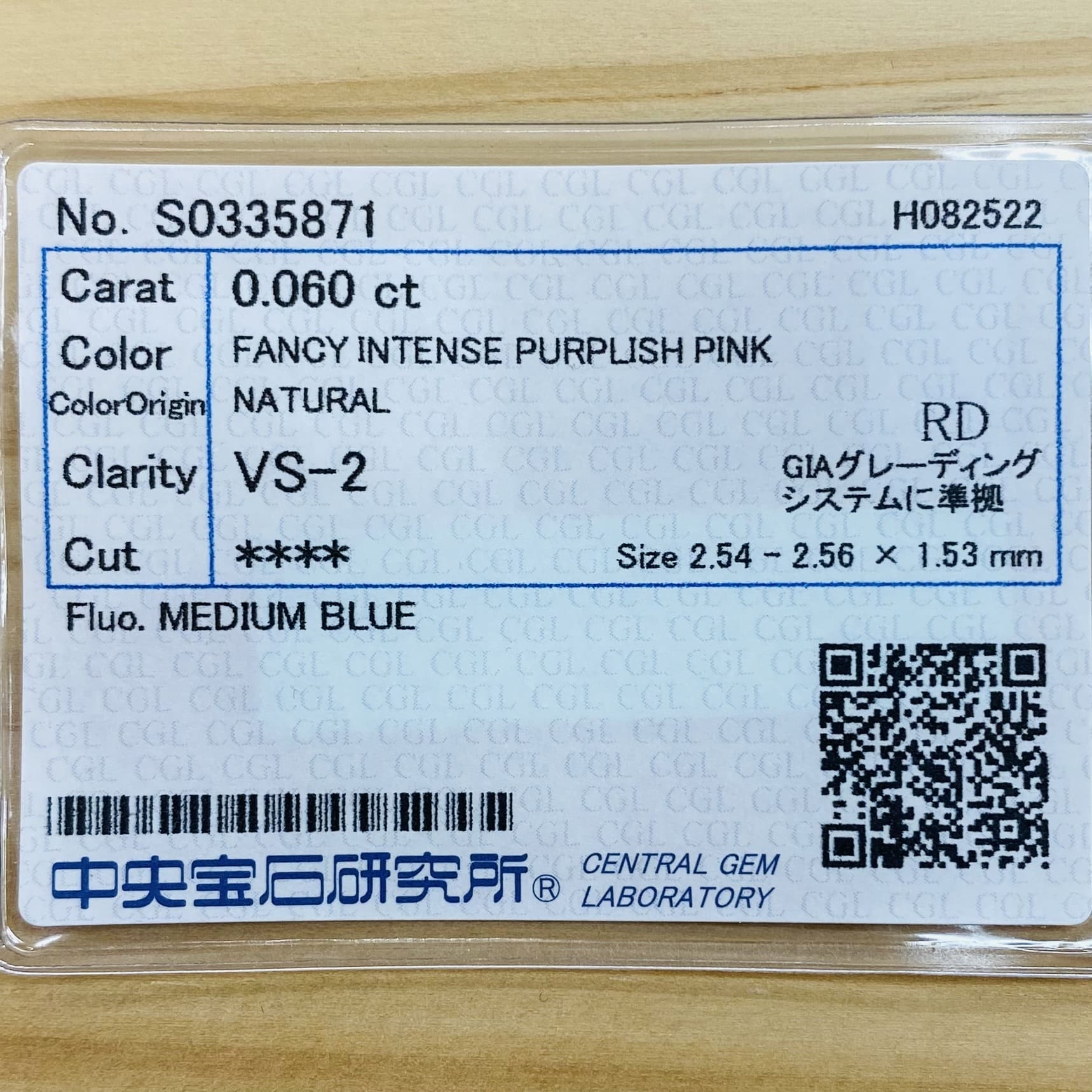 明るく発色の良い青みのあるピンクダイヤモンドです。人気の高いラウンドブリリアントカットです。ピンクとパープルが混ざり合った絶妙なカラー!彩度も強くとても鮮やかで上品な可愛らしさを持っています。見ていて胸が高鳴るような心引き付けられるピンクダイヤモンド!VSクラスで目立つインクルージョンもなく透明感があり、とても綺麗です。