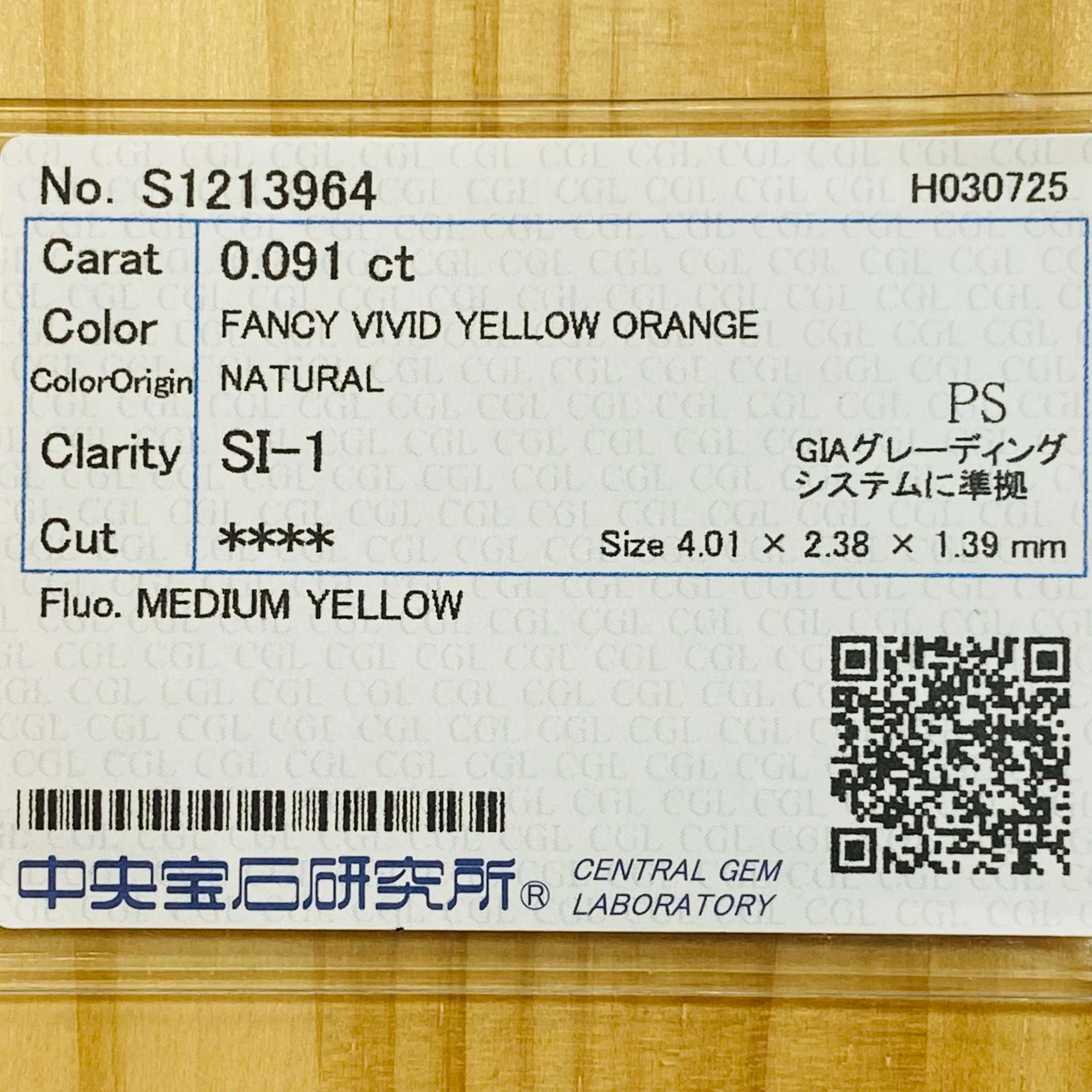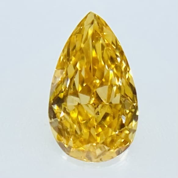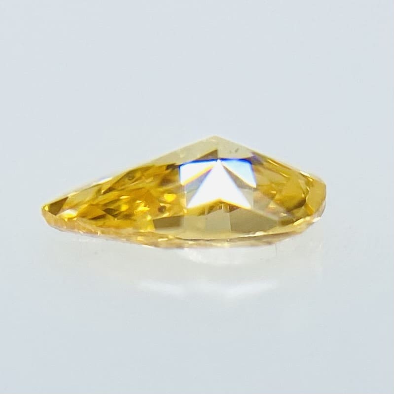 とても明るい、スッキリしたオレンジカラーです。瑞々しいキラキラが眩しい程です。VIVIDのタイプだと濃すぎて茶色みが強いものが多いですがこちらはしっかり濃厚なオレンジを感じていただけると思います。ビタミンカラーでもあり元気をもらえる石であることは間違いないです!カットはバランスの良い、ペアシェイプです。SI1クラスですが、大きな内包物もなく透明感があり、とても綺麗です。MEDIUM YELLOW の蛍光性がこの石の美しさを更に引き立てていると感じます。