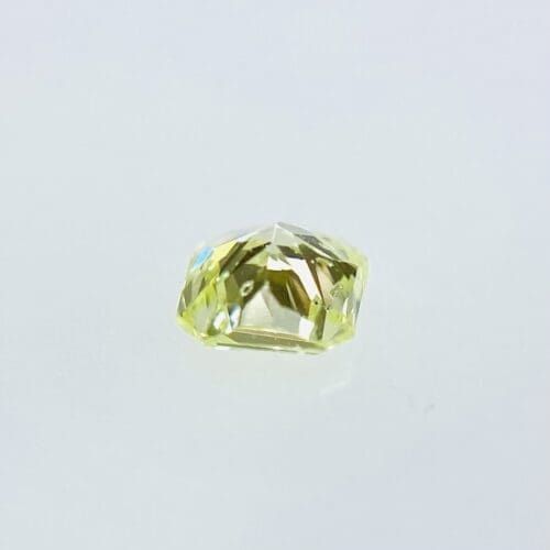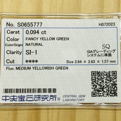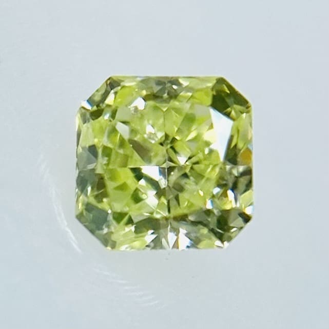 パステル調のイエローグリーンがとても爽やかです。キラキラと瑞々しい光が煌めいています。春の若葉のように、軽やかでとても愛らしい黄緑カラーです。メイクが良く、テリも素晴らしいグリーンダイヤモンドです。小さいですが、とても存在感があります。カットは、バランス良くスタイリッシュなスクエアカットです。SIクラスで、テーブルに透明インクルージョンがありますが全く目立ちません。テリも良くキラキラと輝いています。MEDIUM YELLOWISH GREEN の強い蛍光性がこの石の美しさを更に引き出していると感じます。