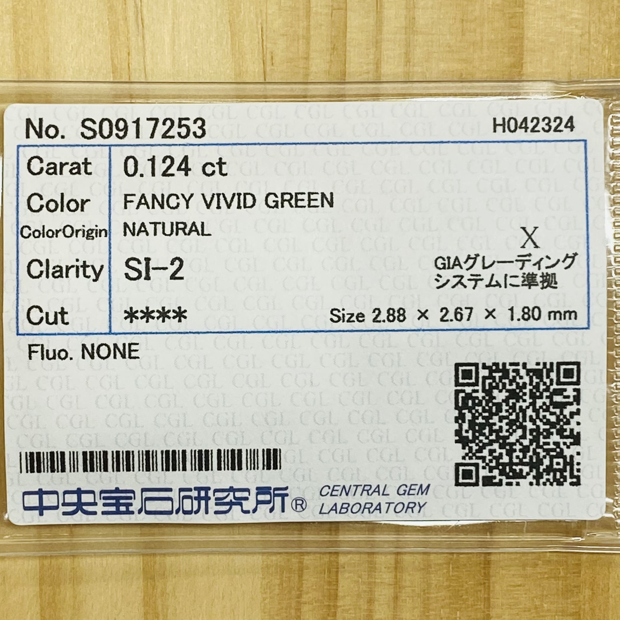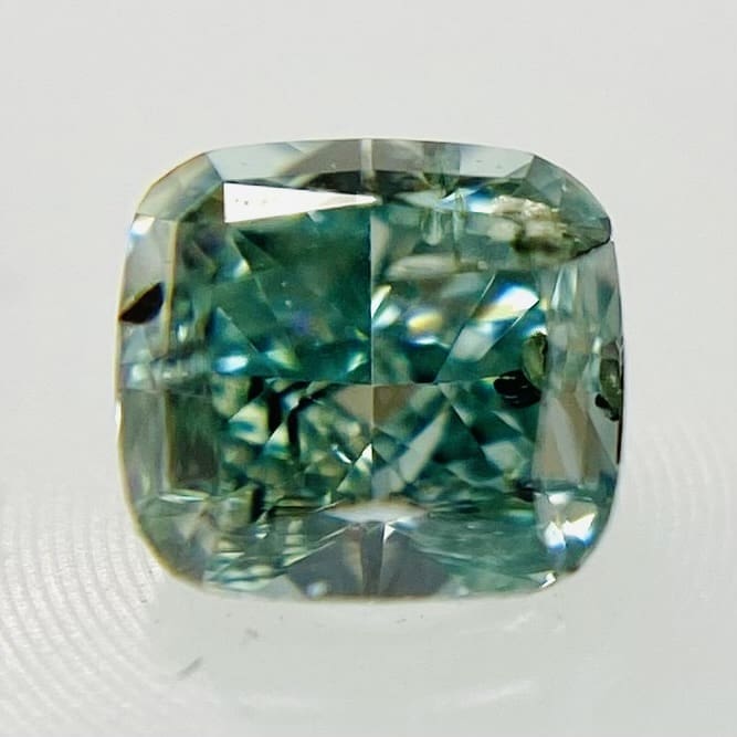 とても美しいストレートグリーンです。ストレートでVIVIDカラーが出ることは稀です。石は少し小さめですがとてもレア感は最大級です。SIグレードで、カーボンありますが色味が濃いため目立ちません。素晴らしいFANCY VIVID GREENです。シェイプは可愛らしいクッションカットです。