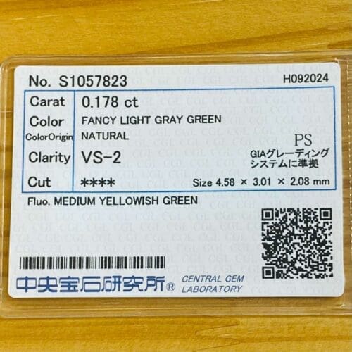 澄みきった、クリアなVERY LIGHT GRAY GREEN色味は薄いですが、とても珍しいカラーグレードです。とても明るく、キラキラしています。コレクションアイテムとしていかがでしょうか?自然の色である緑色は、自然治癒力を高め回復などを意味するとされています。そしてグリーンダイヤモンドは、恵みを意味し健康運を上げる効果があると言われています。こちらも非常に希少な宝石と言われており身につける人の心と体を癒してくれるでしょう。カットはバランスの良いペアシェイプです。VSグレードで綺麗な石です。