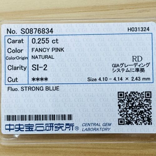 GIAガードルNo.2484960571ピンクとパープルが混ざり合った絶妙なカラー!彩度も強くとても鮮やかで、上品な可愛らしさを持っています。ラウンドならではのキラキラ感も素晴らしいです。見ていて胸が高鳴るような、心引き付けられるピンクダイヤモンド!少しパープルが混ざることによってピンクの印象がより鮮やかに感じます。ストレートピンクよりこれが好きっておっしゃる方が非常に多いのには納得がいきます。実際見て頂くと可愛さが違って見えます!見ていてドキドキしてしまうダイヤモンドです!これっと思ったら是非、お早めにお問い合わせください!!人気の高いラウンドブリリアントカットです。SIクラスでテーブルに小さなカーボンインクルージョンがありますが肉眼では全く目立ちません。テリのよいピンクダイヤモンドです。