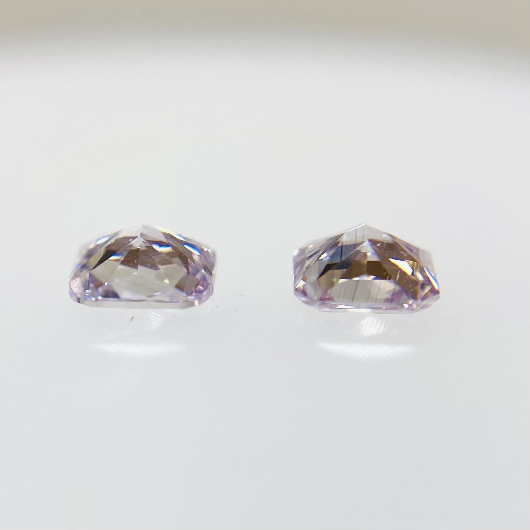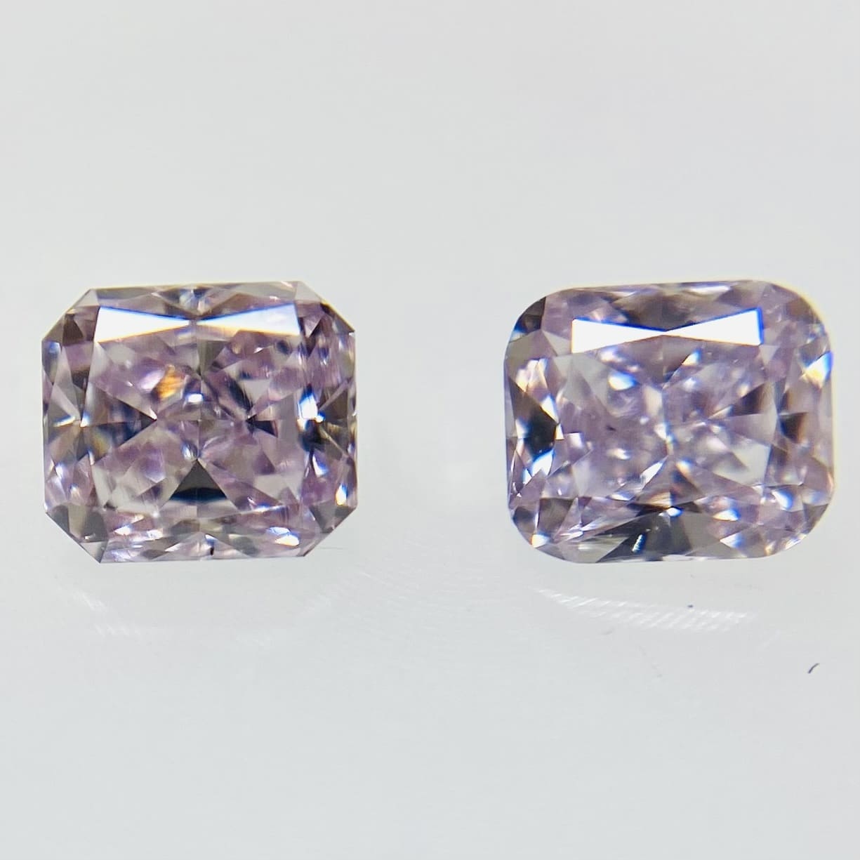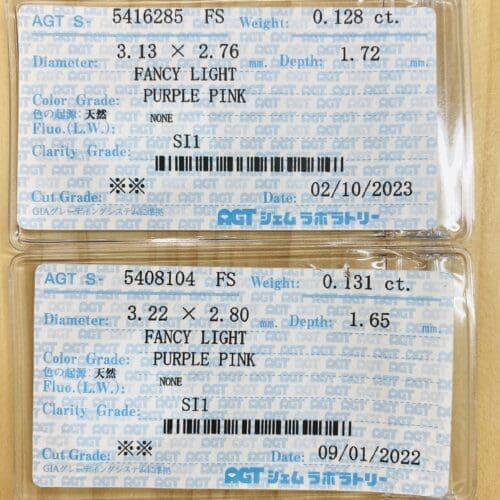 *こちらはセットでの販売です。ピンクとパープルが混ざり合った絶妙なカラーです。メイクもクラリティも良いです。一言にピンクと言いましても、その中でもかなり色ランクの差が大きいのがピンクだと思います。中でも、このピンクダイヤモンドは優しい色味ですが、ファンシーライトではなくファンシーと言っても良いほど色は乗っています。形は可愛らしいクッションカットです。