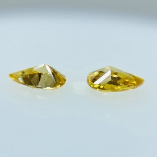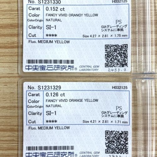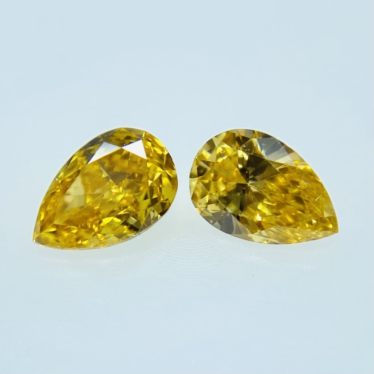 *こちらはセットでの販売です。FANCY VIVID ORANGE YELLOW 0.126ctFANCY VIVID ORANGY YELLOW 0.152ct色味、形、大きさどれをとっても非常に似ております!素晴らしいVIVIDカラービタミンカラーでもあり元気をもらえる石であることは間違えないです!カットはペアシェイプです。いいペアリングです。SIグレードで目立つインクルージョンはありません。テリも良く綺麗なペア石です。MEDIUM YELLOW の強い蛍光性がこの石の美しさを更に引き立てていると感じます。