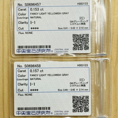*こちらはセットでの販売です。発色の良いメタリックカラーしっかりグレーを感じることが出来ます。石が揺れたときのシンチレーションが何とも言えません。雲の間からチラッと太陽が見えるような眩しさもあります。プロポーションが良いのでブリリアンシーも大変良いです。グレーダイヤモンドは、あまり市場に出回らないレアストーンとなります。グレーカラーよりも、無色透明のダイヤモンドが重要視された為です。近年価値が見直され、需要は増えつつあります。それでも数は少ないです。グレーは水素が入ることにより色が着くそうで内放物によるカラーではなく原子レベルで色が着いているようです。I1グレードでフェザーインクルージョンありますが照りが良いので全く目立ちません。