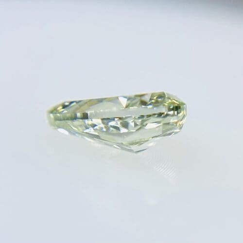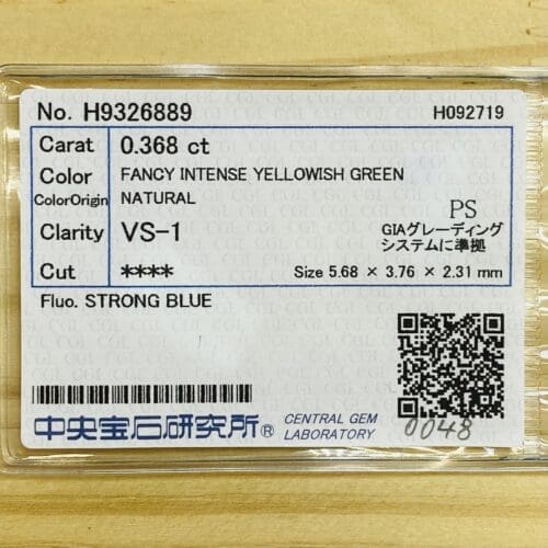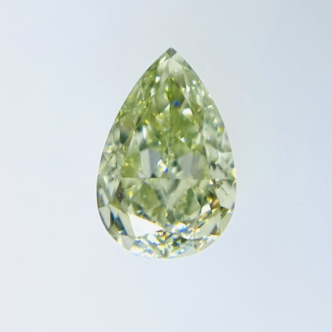 春の若葉のように、可愛いアップルグリーンにも感じるようなダイヤモンド!INTENSEの中でもVIVIDに近い鮮やかな彩度でしっかりと色が乗っています。明度も非常に高く目に焼き付いてしまう美しいカラーです!黄色みはあまりなく、ストレートグリーンに近いイメージです。VSで、目立つインクルージョンもなく大変美しいです。テリが眩しいほどです。カットはバランスの良い、ペアシェイプです。