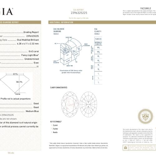 透き通る湖のようなストレートBLUEFANCY LIGHTの中でもかなり彩度は高く、大変美しいです。水面の光がキラキラ反射しているようにテリもよいです。Iクラスで小さなカーボンありますが、透明感もあり素晴らしいブルーダイヤモンドです。色の起源がUNDETERMINEDとなっております。こちらは、色の起源がUNDETERMINED(未定/現時点判別不可)です。青・緑系のダイヤモンドの起源はすべてのダイヤモンドについて自信を持って決定することは難しく場合によっては自然に照射されたグリーン系ダイヤモンドを実験室で照射されたグリーン系ダイヤモンドから分離することは現時点では困難または不可能だそうです。