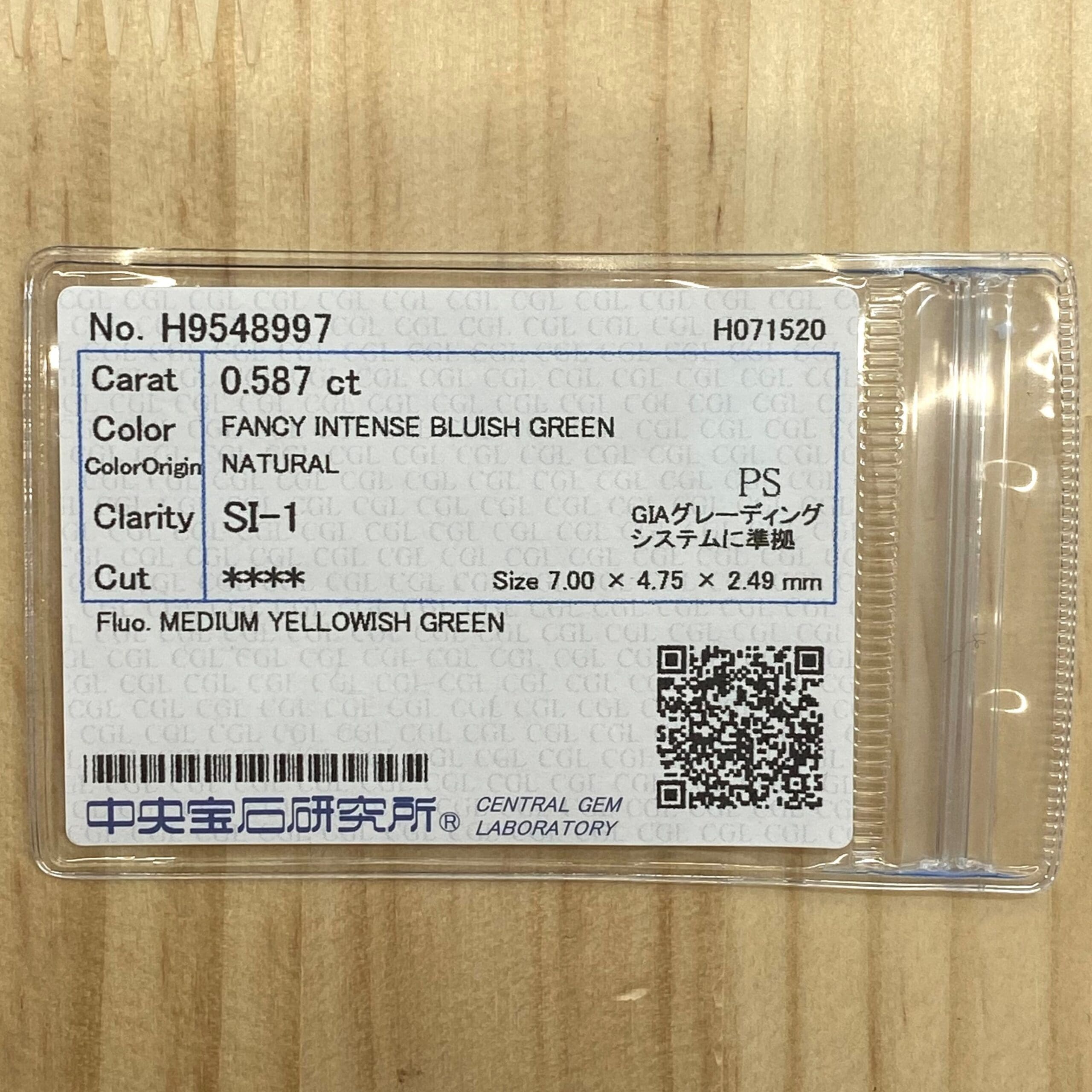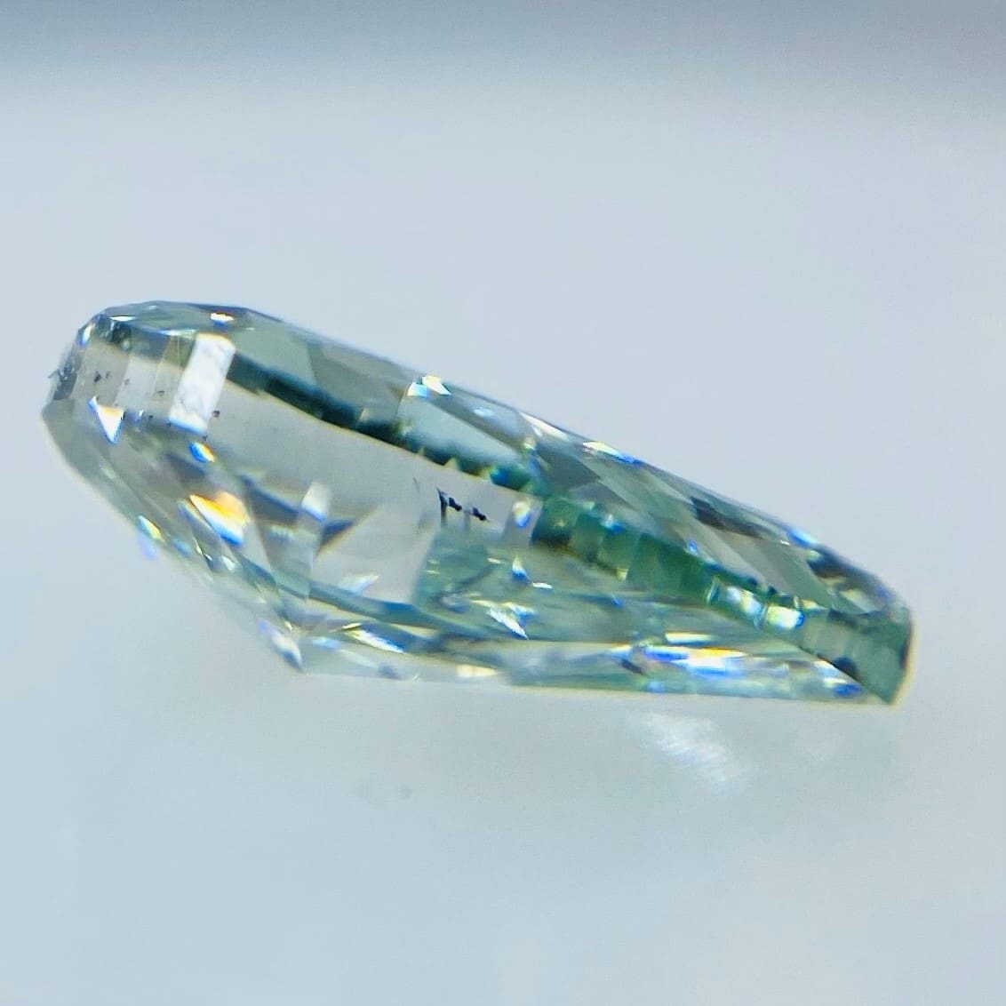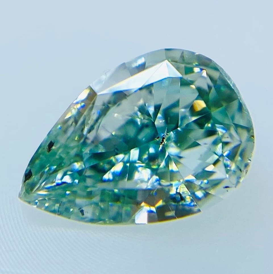 春の息吹に揺れる木の葉のように優しい色味のFANCY INTENSE BLUISH GREENカラーダイヤモンドの中でも最も稀少とされるナチュラルグリーンダイヤモンド。原石が地中に存在している際に原石の近くに放射線を発する物質から影響を受けグリーンに色づくとされるグリーンダイヤモンド。世界で最も大きなグリーンダイヤモンドはかの有名なドレスデングリーン。朝露のようにみずみずしい透明感と揺らめきがある石です。カットはとてもバランスの良い、ペアシェイプです。SIクラスで、テーブル中央に極小の黒色インクルージョンがありますが肉眼では確認できません。ガードル付近に黒色インクルージョンと、ナチュラルがあります。非常にテリがあり、透明感があります。
