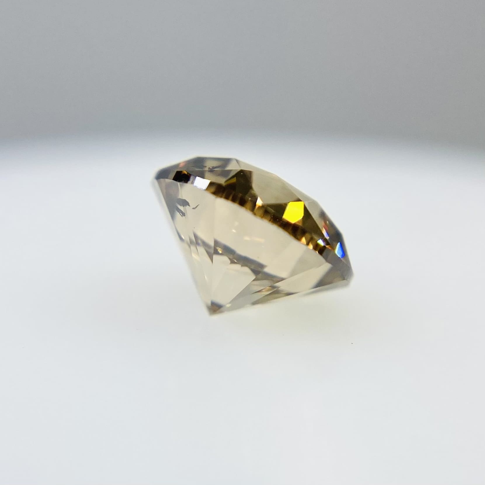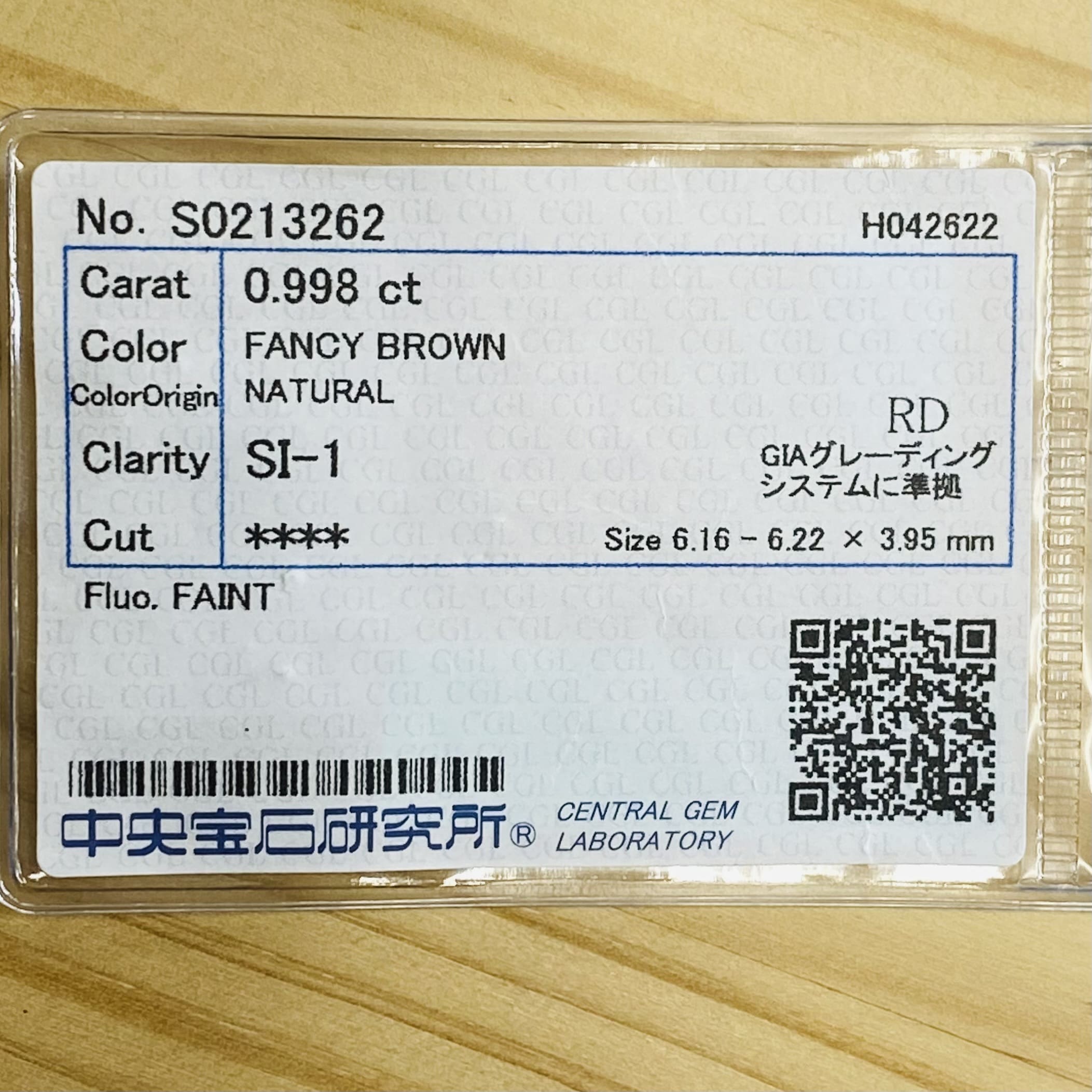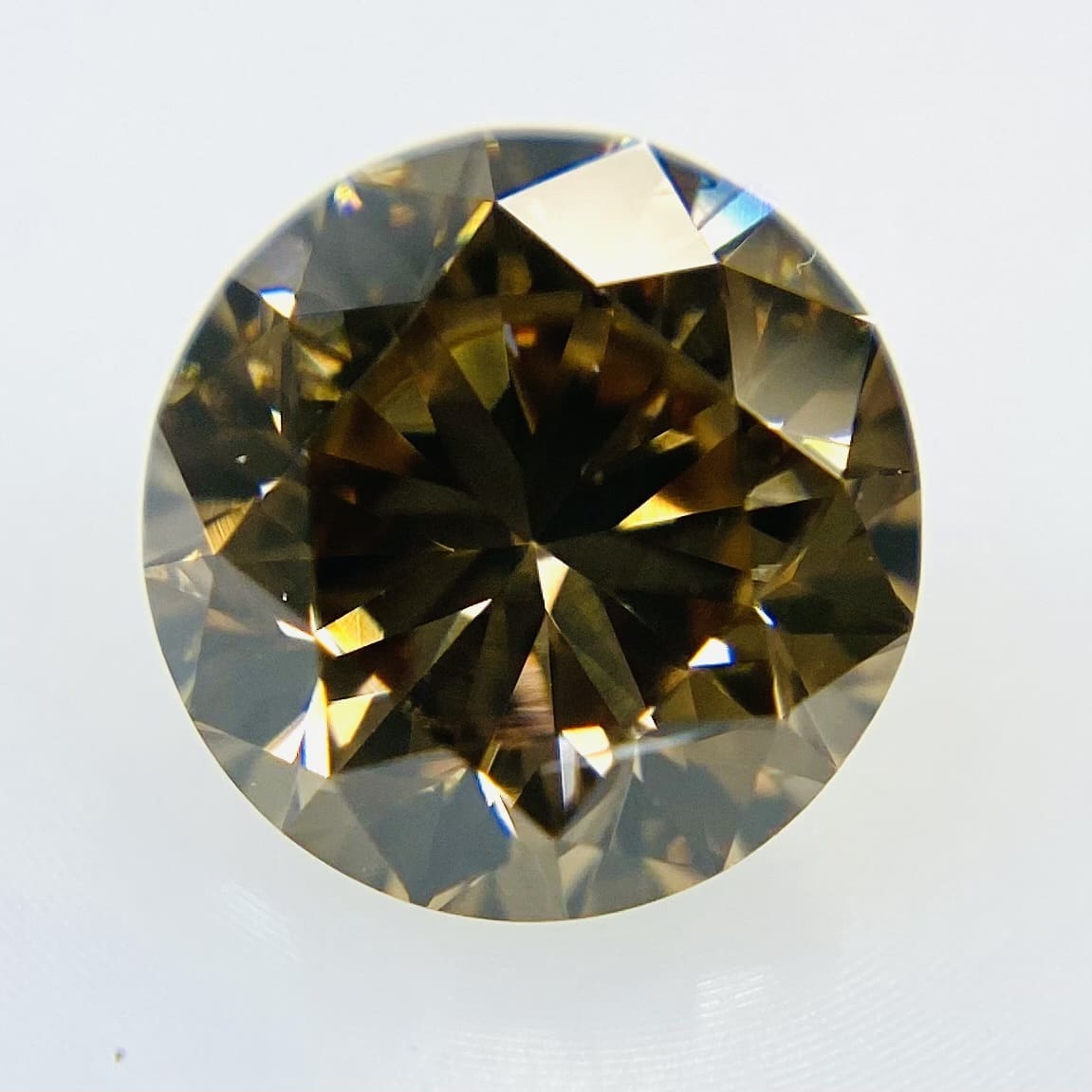 とても肌なじみの良い、優しいブラウンです。全体的にほんのりとピンク味を感じ角度によって赤みも感じることが出来ます。神秘的な光を放っている、不思議なダイヤモンドです。ダイヤモンドと言えば無色透明な物が真っ先に思い浮かぶかと思いますが実は様々なカラーを持つものだという事でも有名ですね。特にピンクダイヤモンド等は日本国内でも非常に人気が高く様々なジュエリーで見かけることも多いはずです。しかし、宝石としてはあまり良いイメージがわかないカラー『茶色』を発色するブラウンダイヤモンドと聞けば皆さんどのようなイメージを思い浮かべるでしょうか?ほとんどの方はイエローダイヤモンドやブラウンダイヤモンドなどの茶色っぽい色を発色しているものは粗悪品で価値が低いと思っていることでしょう。しかし、実はブラウンダイヤモンドは一概に評価が低いというわけではなくブラウンの発色の仕方によっては非常に高い評価を受けるものがあるのです。サイズは0.9ct UPで存在感があり、大変強いカラーを放っております。シェイプは、バランスの良いラウンドブリリアントカットです。SIで目立つインクルージョンもなく、テリもいいです。