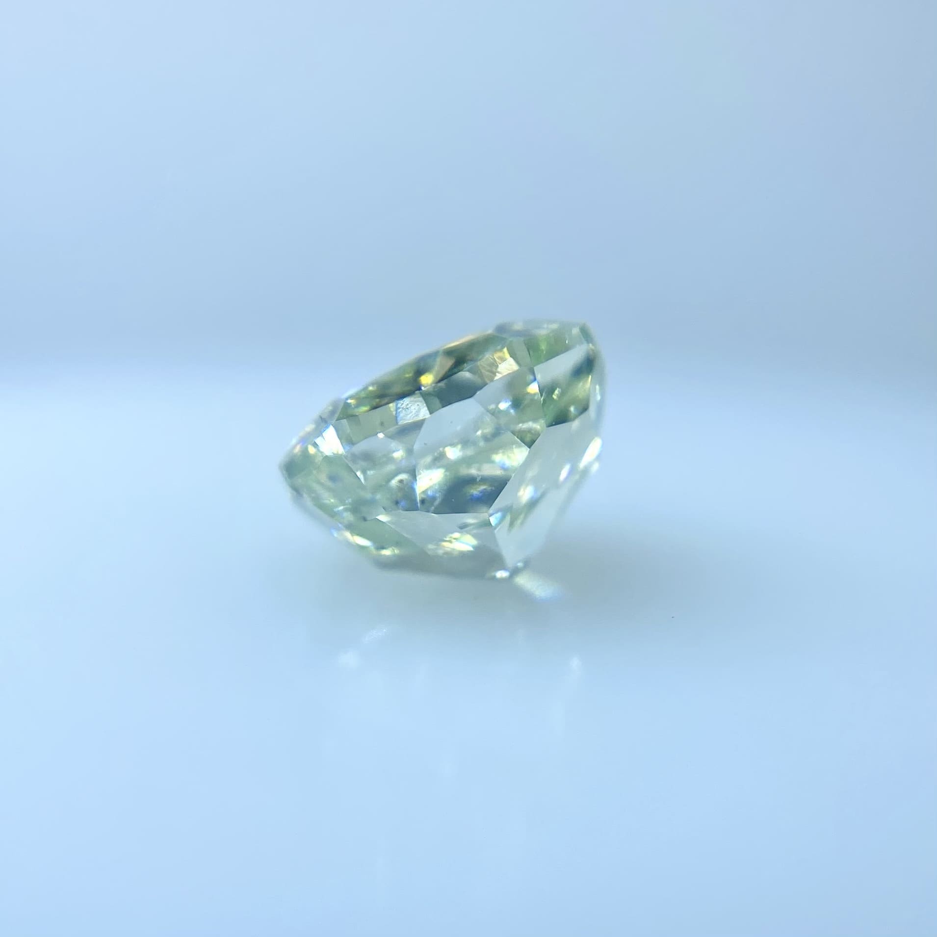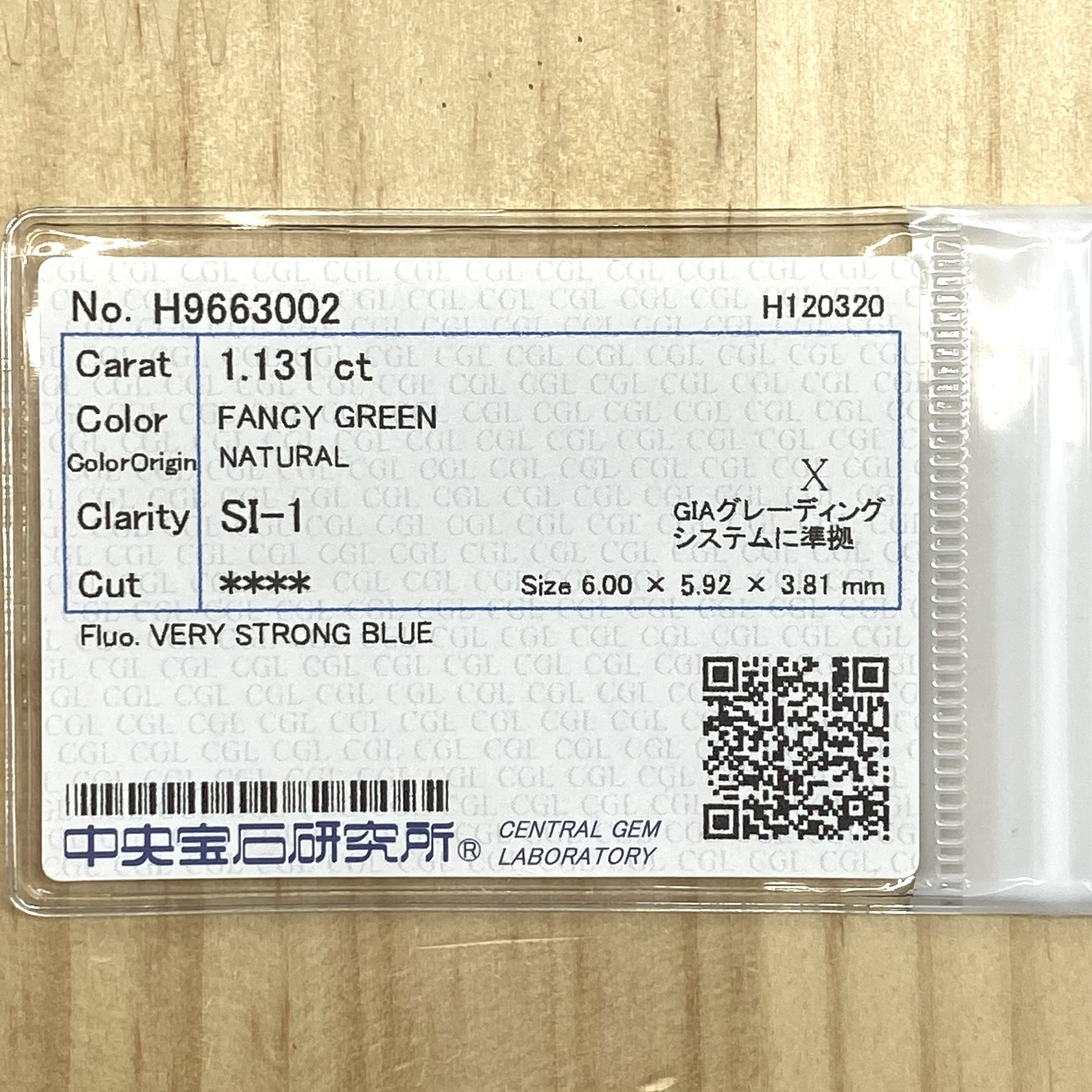 見事なストレートグリーンのダイヤモンドです。ファンシーですが、実際はインテンスに引けを取らないほど綺麗です。くっきりと美しく、みずみずしい色合いに誰もが見惚れてしまいます…。南国の深い海に潜っているような神秘的で身も心も包まれる逸品です。SIグレードで、小さなカーボンありますが目立ちません。素晴らしいFANCY GREENです。シェイプはバランスの良い、クッションカットです。1ct以上あり、迫力のあるダイヤモンドです。