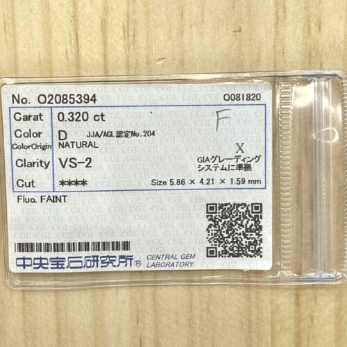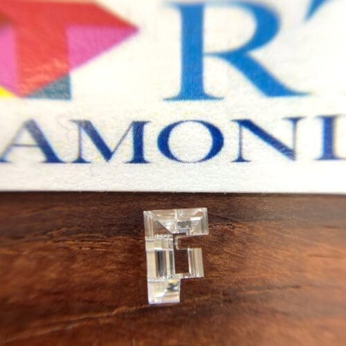 ダイヤモンド一つで『F』を形成しています。メレなどで文字や形を作ることはよく見られますがこのタイプは大変希少です。Dカラー、VS2とグレードも良いものです。他には絶対にない珍しいカットですので、気になった方は是非!お買い求めください!!!
