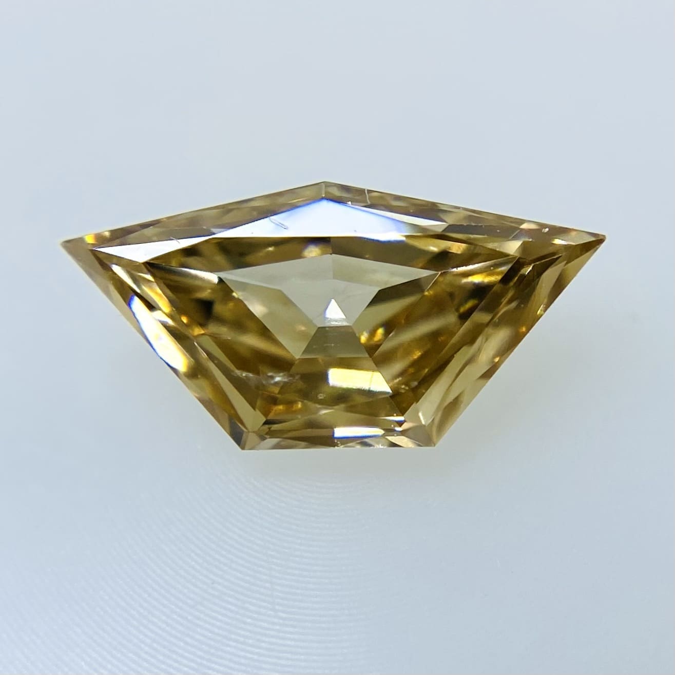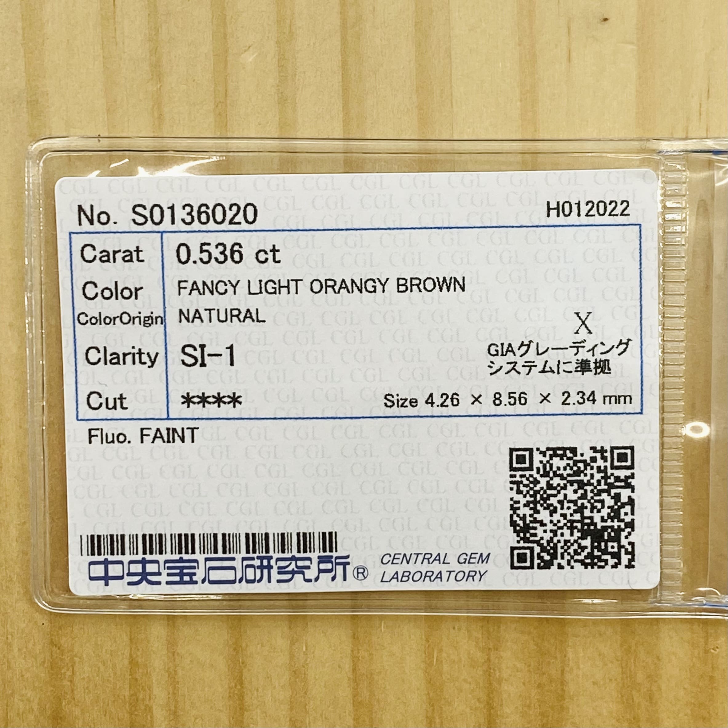 ユニークな五角形のダイヤモンドです。フラットな形の五角形で、とびきり個性が光ります。透明感があり、テリがよく眩しい限りです!五角形は邪気の入り込む隙間のない完全な形とされ、邪気を祓い幸運を呼び込む形とされています。FANCY LIGHT ORANGY BROWNでやや明るめの赤みがかったブラウンです。FANCY LIGHTですが、色はしっかり乗っています。優しいヌーディーカラーで、品の良さを感じさせます。アースカラーのブラウンは、人類にとって古代から馴染みのある色で自然を感じる温もりや、居心地の良さといった安心感を与えてくれます。SI1で、クラウンにかけて小さなフェザーがありますが肉眼では見えずらく、色味を損ねるものではありません。他には絶対にない珍しいカットですので、気になった方は是非!お買い求めください!!!